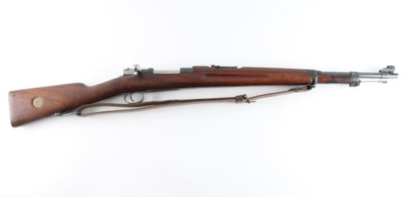 Rifle. Vintage Swedish military bolt action 1896 Mauser short rifle chambered in 6.5x55mm Swedish, manufactured in Germany by Mauser Oberndorf, A/N, under Swedish Military Contract, in 1999 and latter converted to M38 configuration. Imported by Class Dist. Swan, V.T. with import marks on the underside of the barrel. Features a blued finish, 23.5" barrel, hooded patridge front sight, ladder style rear sight. Cleaning rod, smooth trigger, internal 5 round box magazine, integral stripper clip guide cuts in the receiver, straight bolt handle, three-position manual safety on the bolt, smooth brown leather sling, smooth wood handguard and straight grip shoulder stock with finger grooved forend, brass "Torpedam, Overslag" stock disc & smooth metal buttplate. Serial numbers match on the receiver, bolt(in four places), buttplate. Floorplate is stamped "440". Crown proofs, stock cartouches present. Rifle retains approximately 80% of it's blued finish showing thinning and wear on floorplate, triggerguard. Pitting is present on the front barrel spring. Action is smooth, the bore is dark/dirty, but strong rifling. Wood is good with scratches/dings. Polished buttplate, bolt, and cleaning rod. NRA Condition-Good. C&R firearm.