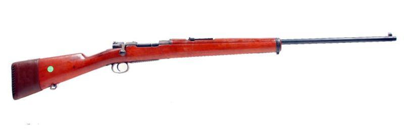 Mauser Chilean 1895 Cal 7.65x53mm SN:A5858, Bolt action military rifle with Chilean crest on the receiver. Blued finish, refinished and shortened wood straight grip stock with added, slip on, rubber recoil pad, 29" barrel, original ladder style militSN:A5858, Bolt action military rifle with Chilean crest on the receiver. Blued finish, refinished and shortened wood straight grip stock with added, slip on, rubber recoil pad, 29" barrel, original ladder style military sight graduated to 2000yards, bolt handle has been turned down, rear sling swivel. Condition: Very good with all matching numbers and intact Chilean crest. An original stock would certainly help this puppy.