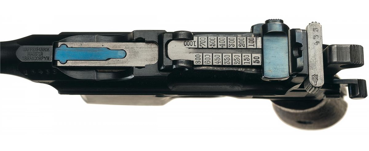 This is a very early wartime commercial model 1896 Mauser pistol with the small ring hammer. The top of the chamber is marked "WAFFENFABRIK/MAUSER/OBERNDORF A/N" with the serial number stamped on the left side flat of the chamber. There is a single "Crown/U" proof on the left side of the barrel extension and on top of the rear section of the bolt. It has the standard "NS" marked hammer, fixed blade front sight with the adjustable rear sight graduated from 50-1,000 meters. It has the standard grooved walnut grips with a lanyard ring on the butt. It has a pre-war blue finished with brilliant niter blue rear sight, extractor and safety and straw colored trigger.