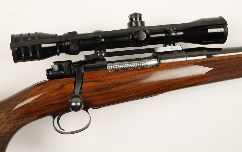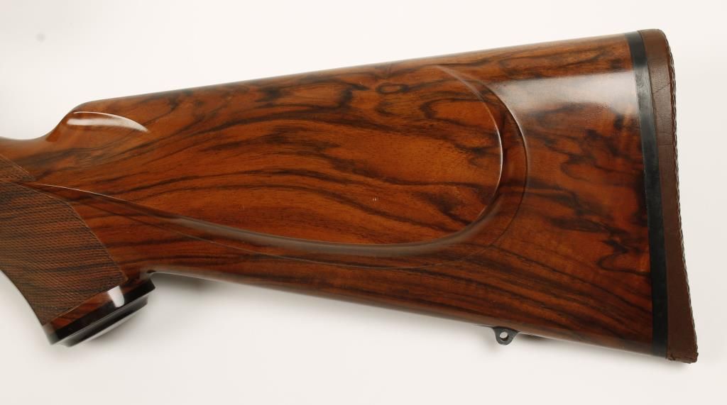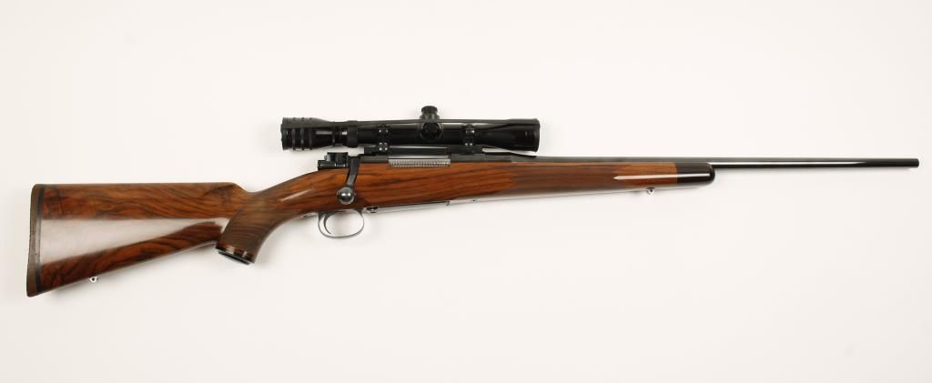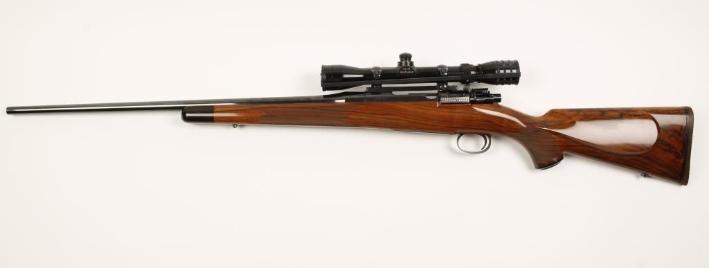 Beautiful custom Mauser bolt action rifle with 23" barrel. Blued finish, checkered pistol grip Claro walnut stock with black forend cap and black pistol grip cap, jeweled bolt, bolt release and magazine follower, no sights and fitted with Redfield 2-7X scope. Barrel marked "Apex" over "Imperial". Excellent bore and action. Condition: Excellent showing fine workmanship. *Modern Firearm*