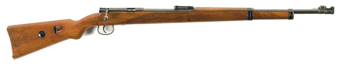 Standard 22 caliber training rifle, "Crown/B" and "Crown/U" proofs on barrel and receiver with "Deuthes Sportmodell" on right receiver. Mismatched numbers with light pitting on top of barrel and repaired lower barrel bands. Complete with push-on muzzle cap.