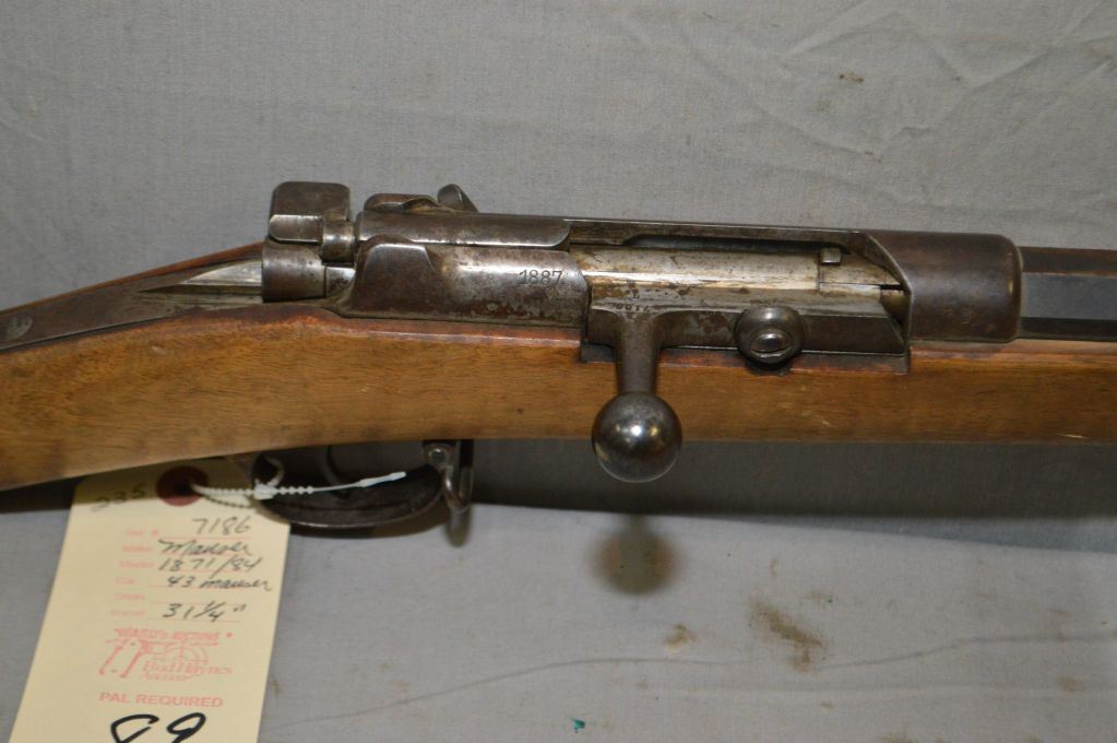 Mauser ( Danzig ) Model 1871/84 Dated 1887 .43 Mauser Cal or .11 MM Mauser Cal Full Wood Bolt Action Military Rifle w/ 31 1/4" bbl [ blued finish turning brown, appears to be matching numbers, some slight surface rust mostly to receiver and butt plate, good wood, two sling swivels ] Ser # 7186