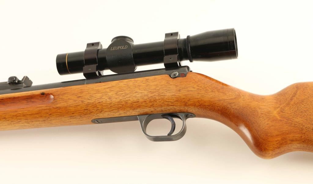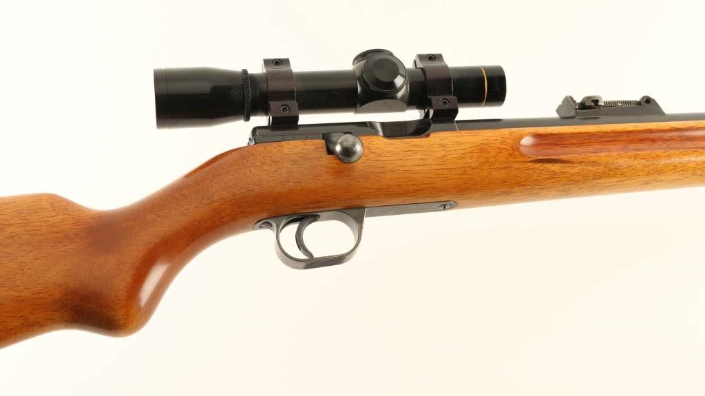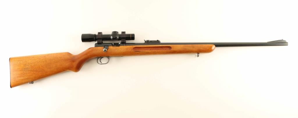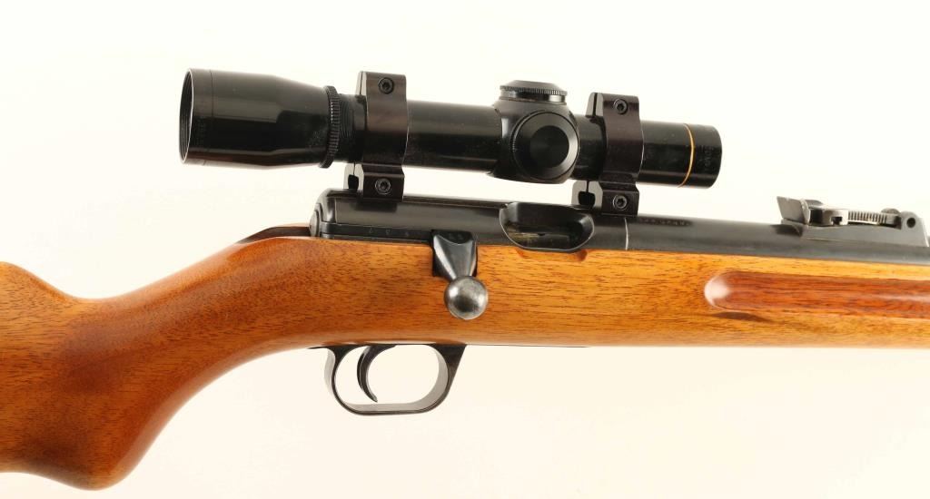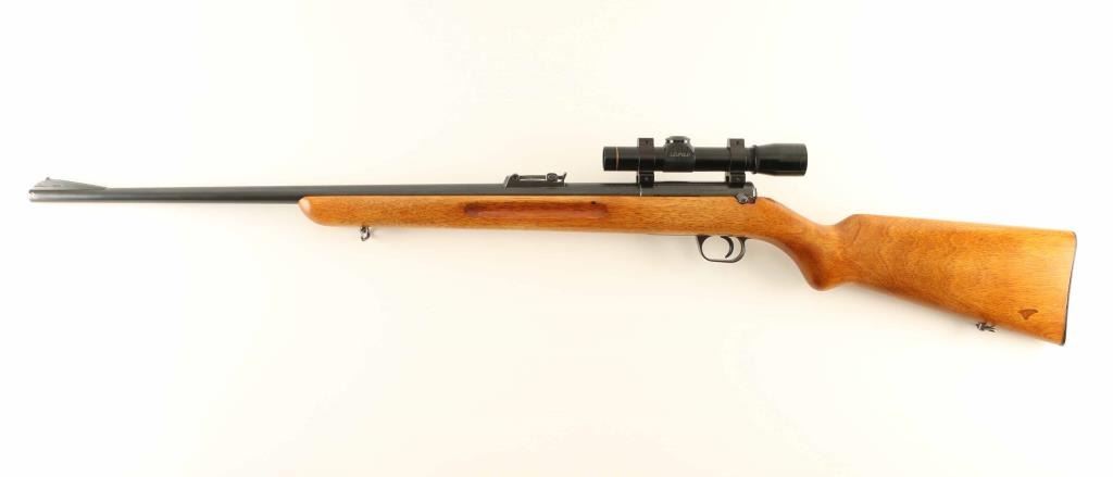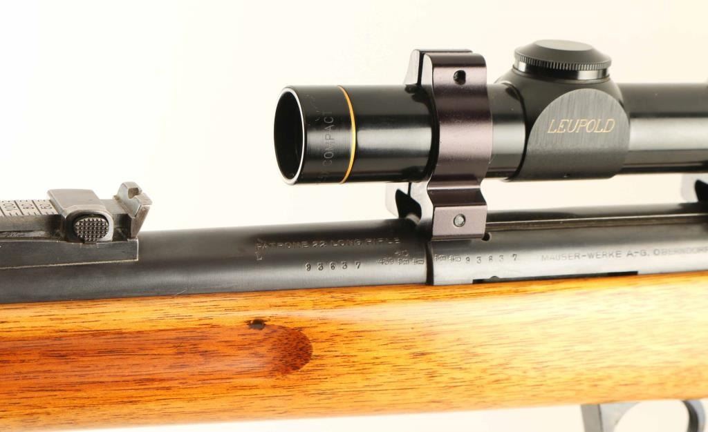 German single shot bolt action rimfire rifle in 22LR. Features blued finish, wood stock, approx 25.5" barrel, manual safety, grooved receiver for scope mounting, sling swivels, blade front sight, tangent rear sight with elevation slider. Bore is excellent; could use a normal cleaning. Retains 85% blue, turning gray at bolt handle, triggerguard and places along barrel, some bare metal showing on most of the sharp edges. Stock is in very good condition; appears refinished with a repair to left side of butt and rounding of edges at forend grasping grooves. Marked "DRP DRGM" on right of barrel for "Deutsches Reichspatent Deutsches Reichs-Gebrauchsmuster" which roughly translates as "Registered Patent". Mauser banner on receiver ring. Stock has a "MAUSER" cartouche on right butt that appears to be deepened by scraping. Plastic buttplate is marked "MAUSER". Mounts a Leupold M8 2.5x compact scope with duplex style reticle; view thru scope is clear and bright. Includes rubber bikini type scope lens protector. No import marks observed. Condition is NRA Fine ***C&R Firearm*** [From the Jim Wilkinson Rifle Ranch Collection]