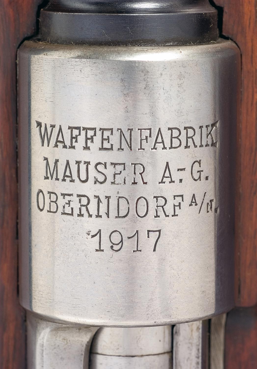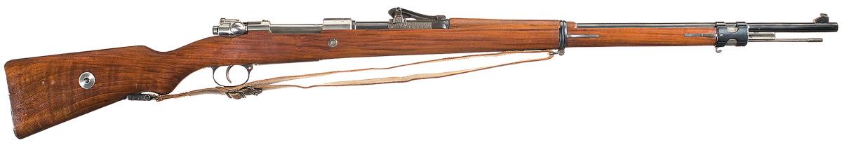 This is a very nice example of a German Gewehr 98 Mauser rifle that has been converted to shoot 8.15x46R ammunition, by modifying the bolt face, extractor and rear of the barrel. This is the economy version with the modified Gewehr rear roller coaster sight. The asterisk marks on the sight base are the range markings for 100, 175 and 300 meters. These ranges were used for competitive shooting. The top of the receiver ring is marked with the three line Mauser/ Oberndorf markings over "1917" and the sidewall is marked "GEW 98". The top of the barrel at the breech is marked "BLG. Sch. H N", the left rear of the barrel and receiver are marked with the matching serial numbers, as well as two crown proofs on the receiver. The bolt handle and floor plate hardware are marked with crown proofs. The forend cap, barrel band springs, receiver, bolt assembly, stock disc and buttplate are bright, the remaining parts blue. Inverted "V" front sight and early "Lange Vizier" or "roller coaster" rear sight graduated on the sides from 4 to 20. The marking disc on right side of buttstock is blank. Most components are marked with the matching full or partial serial number. Mounted with a full one piece pistol grip stock and half handguard. Complete with a leather sling and an original bright iron cleaning rod.