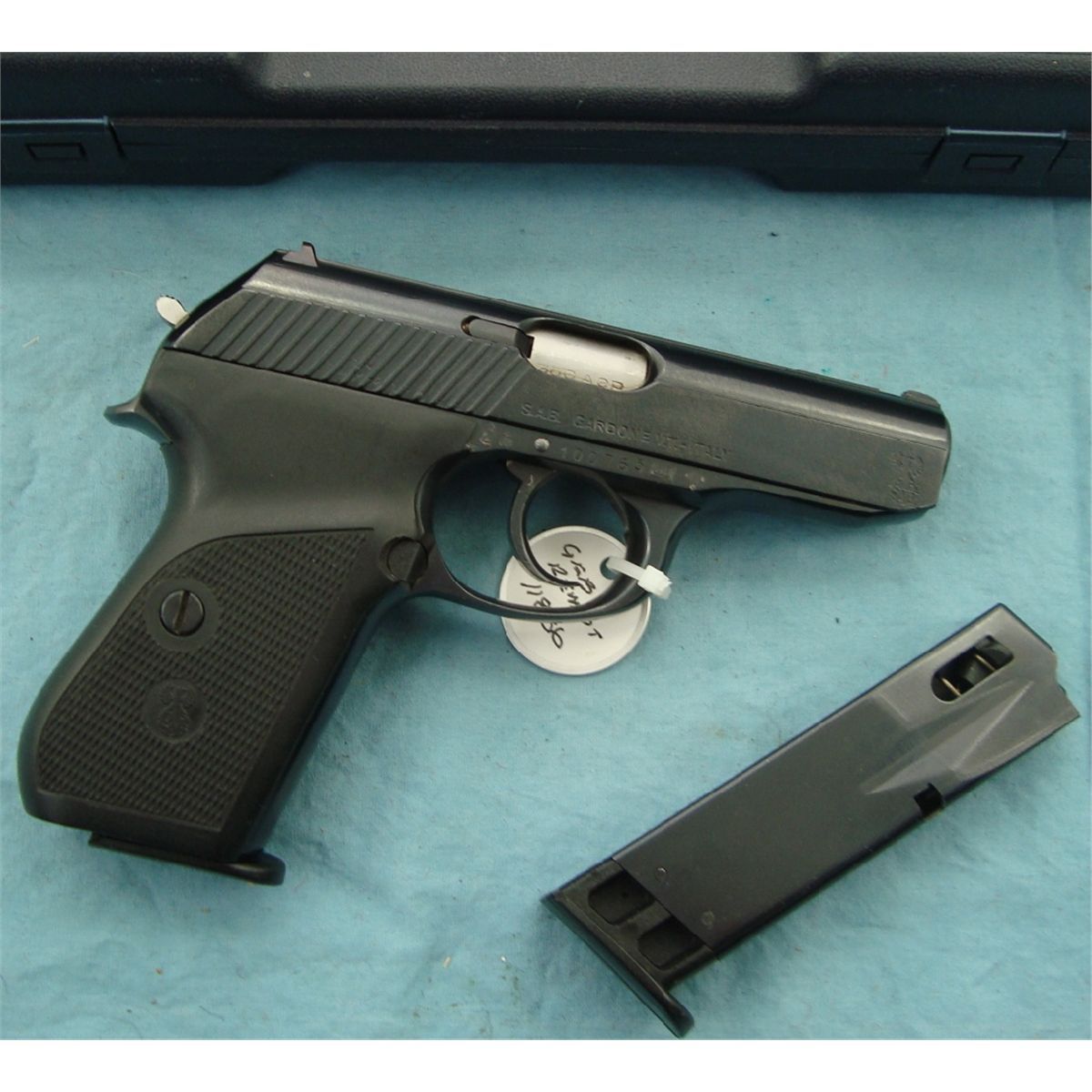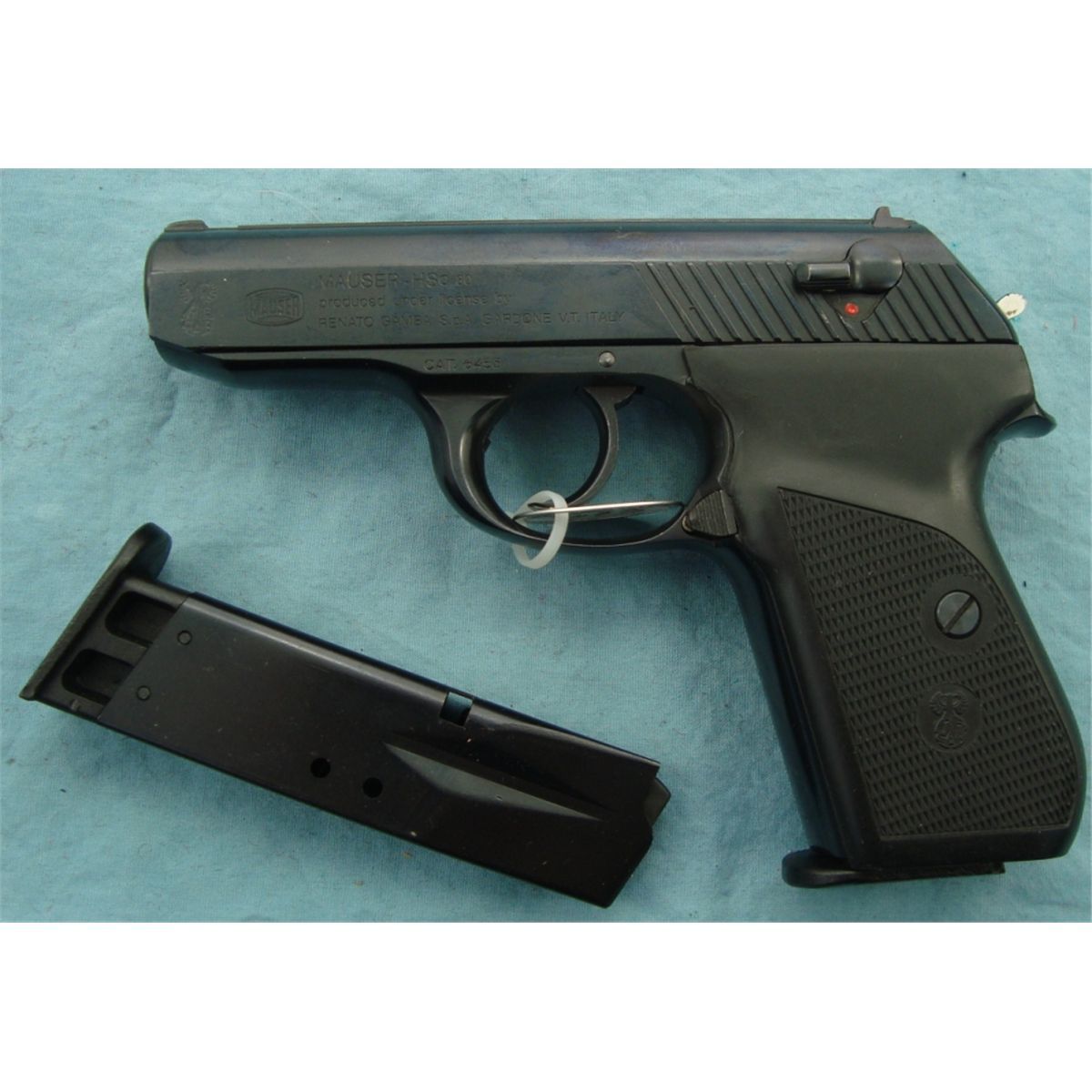 #100765; 380 cal. Mfg. in Italy under Mauser license. Blued finish, plastic grips in like new condition. In original box & extra magazine.