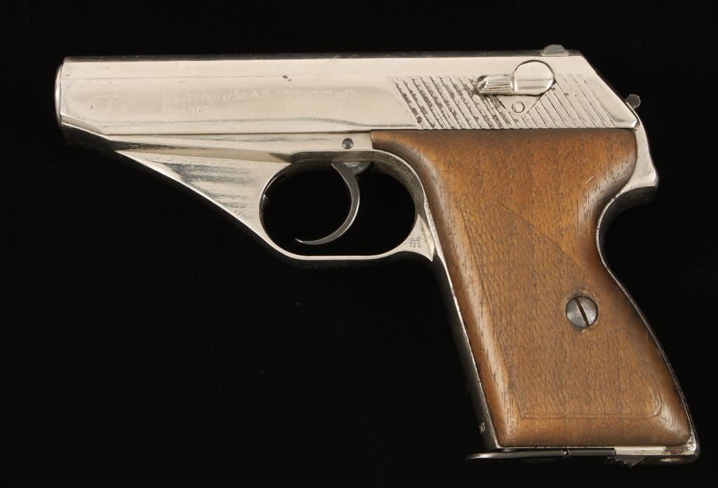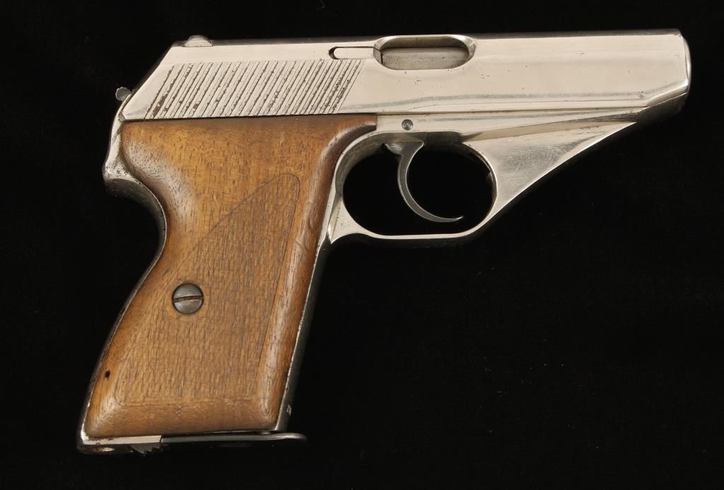 Nickel plated double-action semi-automatic pistol with a 3-1/4" barrel and one magazine. The finish is fading, flaking and wearing to a dull tone with rust perforations in corners. Nazi proofed. Bore is shiny with good rifling. Functions well. Wooden grips with checkered panels are very worn. Has a lanyard loop in the butt. Condition is fair. *Modern Firearm*