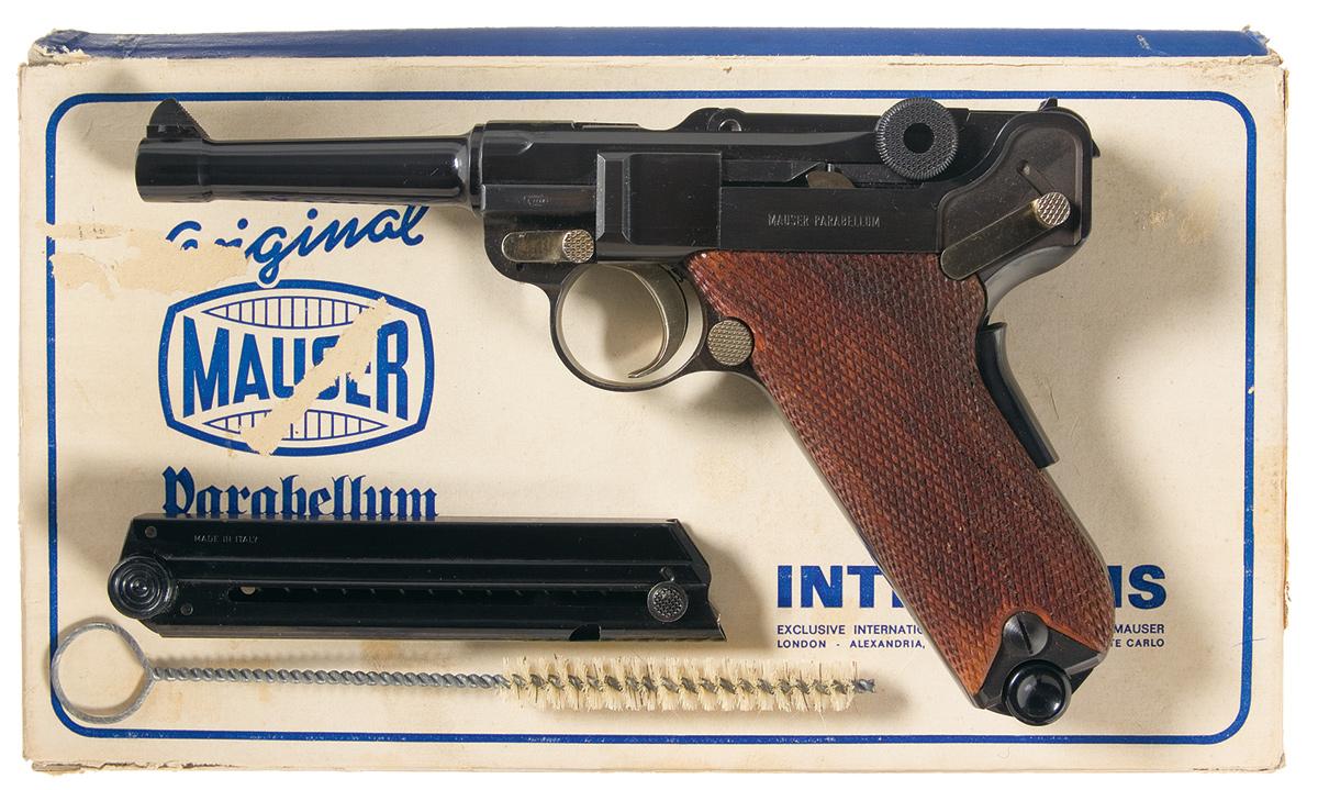 The pistol features a grip safety. The chamber is marked with the "American Eagle" United States Seal and the toggle link is marked with "Original" in script over the Mauser Banner logo. The Interarms name and address are located on the right side of the receiver, and the Mauser address on the front strap. The pistol has a high polished blue finish with straw colored small components. The magazine is blued and has a plastic bottom. The pistol is complete with a blue & white Mauser box numbered to gun, cleaning brush, extra magazine, takedown tool, and test target numbered to the pistol and manual.