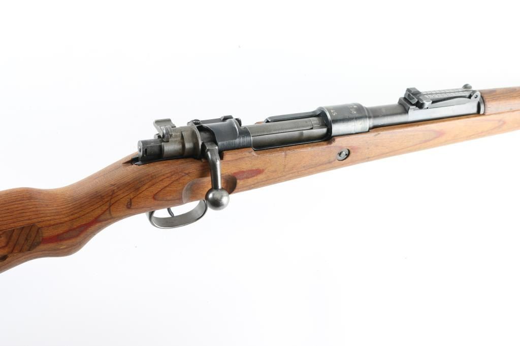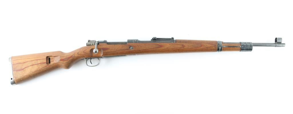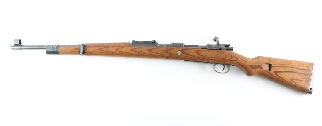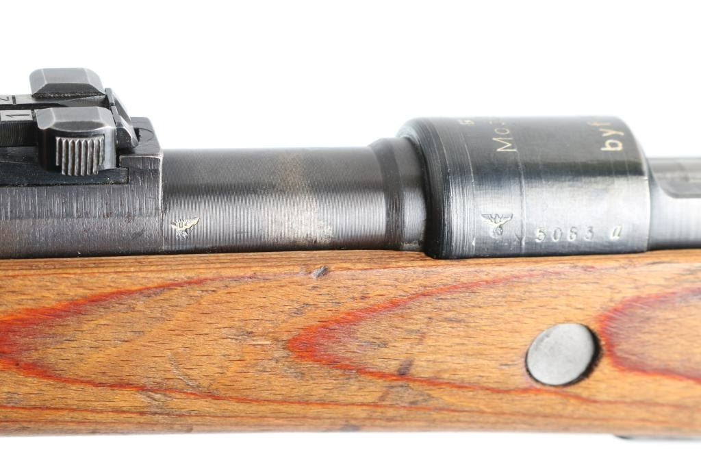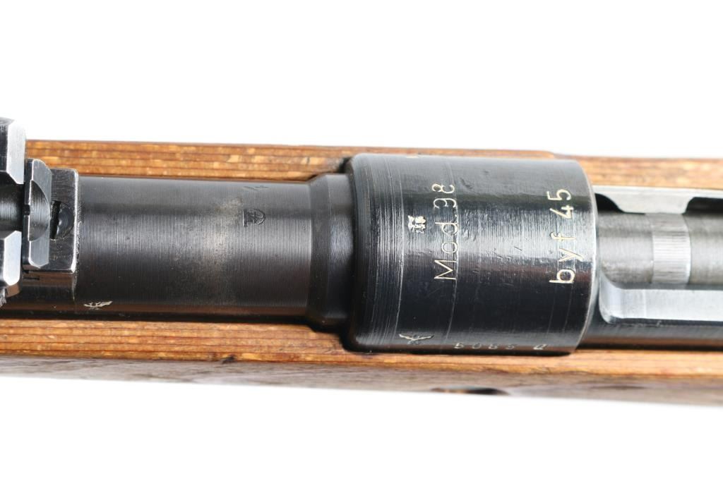 Rifle. bolt-Action. German WW2 military issued Infantry rifle. 24" barrel with hooded ramp/post front and tangent rear sights. This is a late war Mauser "Kriegsmodell". Adopted in late 1944 it is a simplified K98k lacking cleaning rod, bayonet lug, stock disassembly disc and other minor features deemed unnecessary for combat. Stamped barrel bands triggerguard,(In the white, never blued) and "punch Hole" floorplate. Receiver ring stamped "byf 45" with Eagle/Swastika proof and Waffenamt Eagle/135. Also the serial number and "Mod.98" is stamped on the ring. Eagle/135 waffenamts and "byf" stamped on the triggerguard. Serial number mismatched on the bolt, bolt sleeve, and floorplate, the rest unmarked. Cupped, unmarked steel buttplate. Bore appears very good bright.. Blonde wood stock/handguard are very good. Blued finish is about 85%. Bolt, bolt sleeve, and safety latch in the white, never blued.. Action is crisp/tight. Machining marks present on the bolt, and barrel. A rare very late war K98k. NRA condition-Very Good. C&R Firearm.