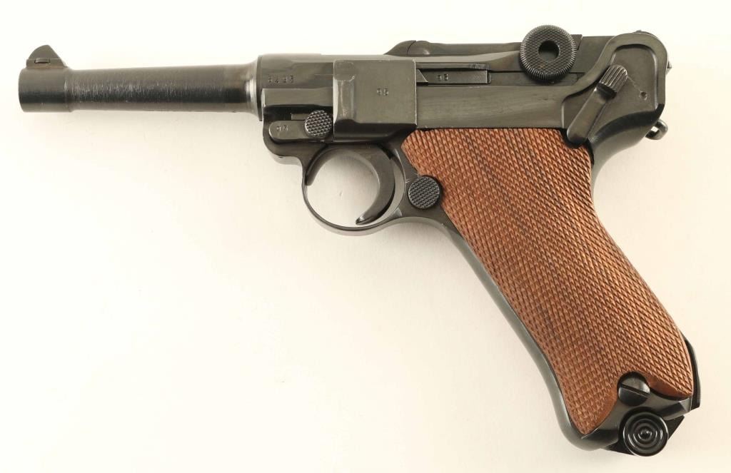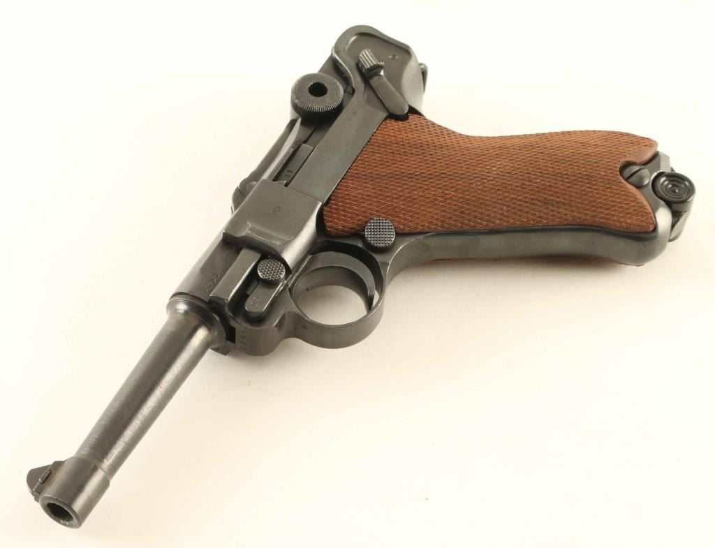 Made in Germany, imported by ZDF, Salt Lake City UT. "P08" marked "byf" on toggle, "41" on slide. Features blued finish (reblued), checkered wood grips (newer replacements), 4" barrel, fixed sights, manual safety, push button magazine release. Bore is very good condition, bright with crisp rifling. Retains 95% reblue, with slight rounding of sharp corners & partial erosion of letters. Grips are excellent condition. left panel is a bit loose. All observed numbers match, barrel does not have a serial number, but has other markings, appears to be a later replacement. Includes one aftermarket magazine. Condition is NRA Very Good+ as reblued *** C&R Firearm ***