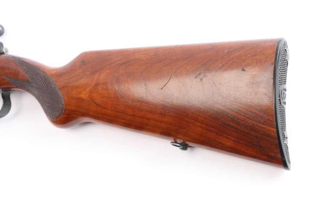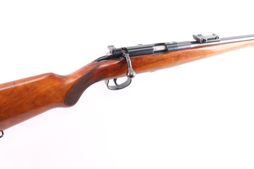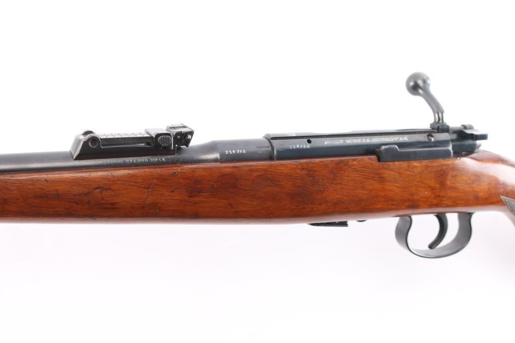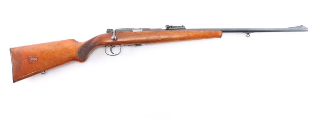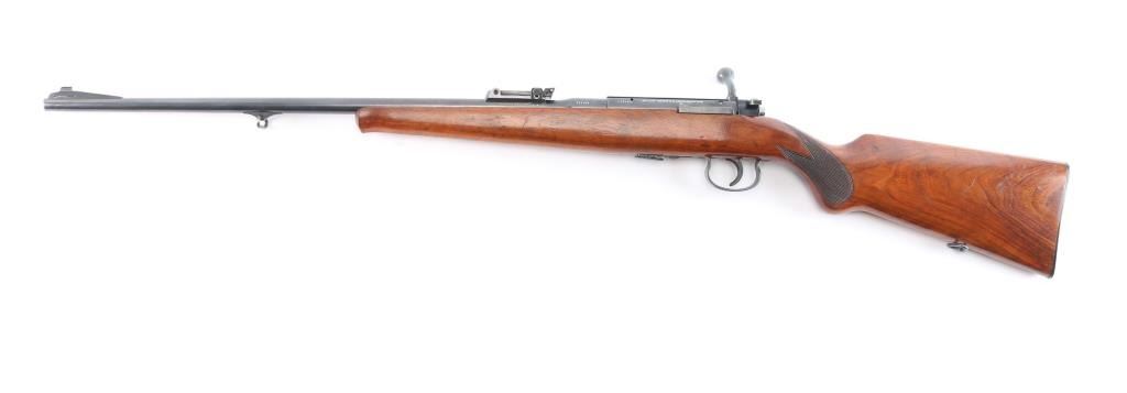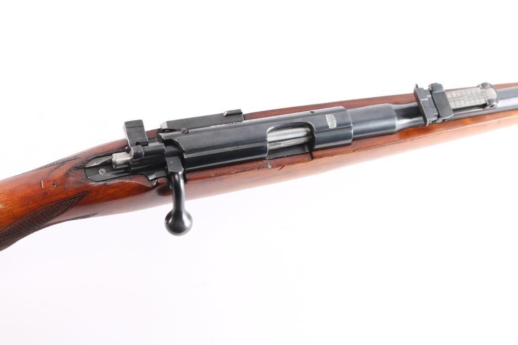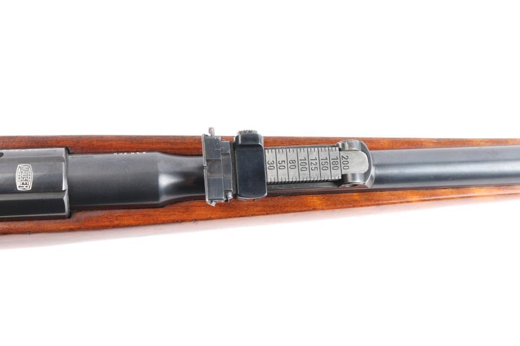 Rare High Quality Pre-war German Sporting rifle. Manufactured c. 1934-35. The rifle uses a detachable spring loaded box magazine and has an interchangeable beaded blade front sight and tangent rear sight graduated to 200 meters mounted on the barrel. There are claw mount scope bases on the receiver. The trigger is serrated and the bottom of the trigger guard is knurled. The Schnabel tipped walnut stock is checkered at the rounded "Prince of Wales" grip and has the Mauser logo on the right side of the buttstock as well as the hard rubber buttplate. Narrow European sling swivels. Crown over "U", "B" and "G" commercial proofs. Matching serial numbers on the barrel, receiver and bolt. The rifle comes with one nicely blued magazine stamped with the Mauser banner on the bottom. The markings are crisp and highlighted in white. The bore is excellent/bright, action is smooth, wood is overall excellent with a few minor scratches/dings and the original blue finish is about 94% with edge wear on the triggerguard, light handling wear on the bolt knob and a very light patch of patina on the mid left barrel.