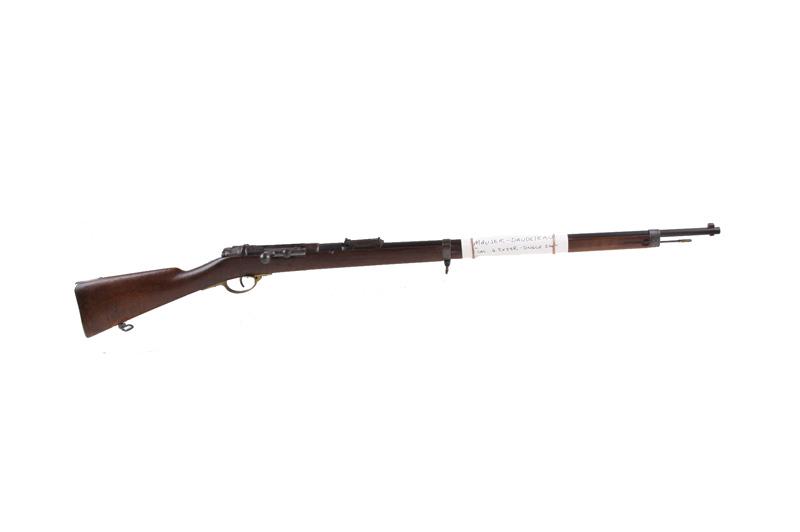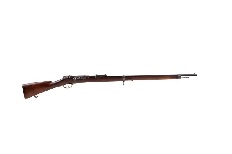 Mauser Mdl 71 Cal 6.5x54R SN:70738 Early Mauser single shot military rifle made in France. Blued finish, full length smooth walnut stock with no hand guard and steel cleaning rod, 31" barrel with military ladder style sight graduated to 1800 meters, goodEarly Mauser single shot military rifle made in France. Blued finish, full length smooth walnut stock with no hand guard and steel cleaning rod, 31" barrel with military ladder style sight graduated to 1800 meters, good bore and action.Condition: Very good with not much sign of typical military use. Brass trigger guard is questionable. Stamped 1879 on right side of receiver.