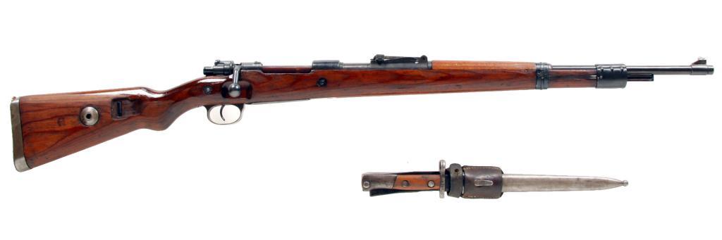 Mauser Mdl 98K 8mm SN:731 Shows check line on breech, no import markings, good German of Nazi proof at center portion of butt stock, shows 95% of period arsenal refinish on metal parts, no German proofs on metal, mismatched numbers, probably captured byShows check line on breech, no import markings, good German of Nazi proof at center portion of butt stock, shows 95% of period arsenal refinish on metal parts, no German proofs on metal, mismatched numbers, probably captured by Germansand reissued during WWII. Markings good, action good, bore near excellent, stock very good+.