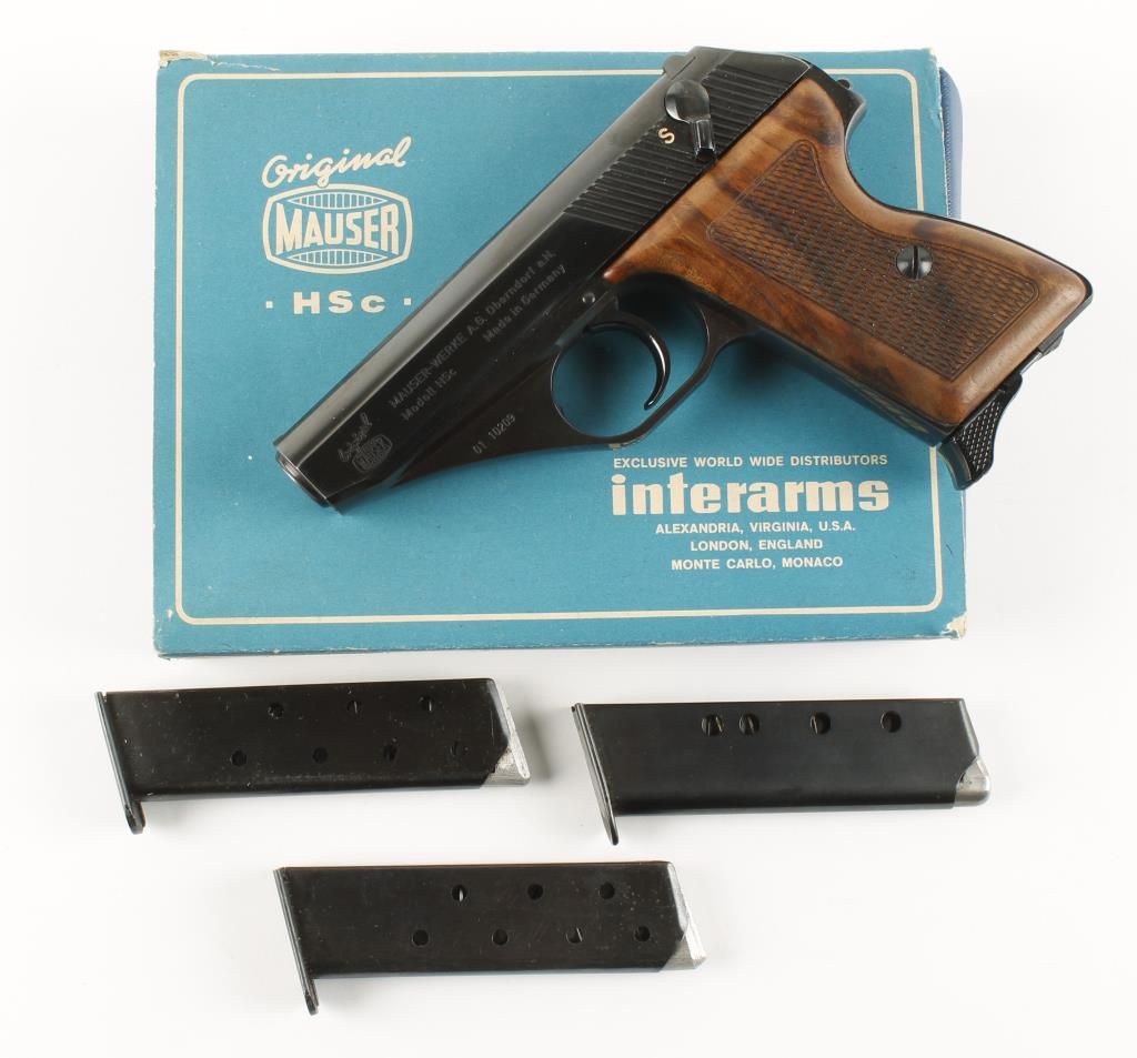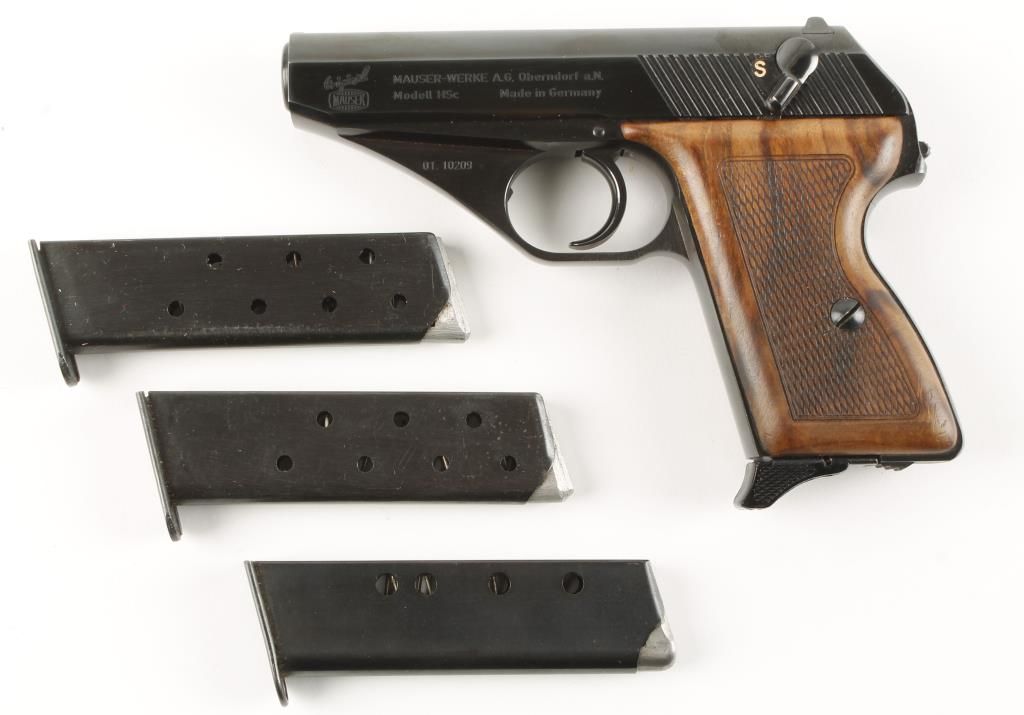 German made double action semi auto pistol with 3-1/4" barrel. Blued finish, checkered walnut grips, left side thumb safety and fixed sights. Excellent bore and action. Includes original box, manual and 4 magazines. Condition: Excellent *Modern Firearm*