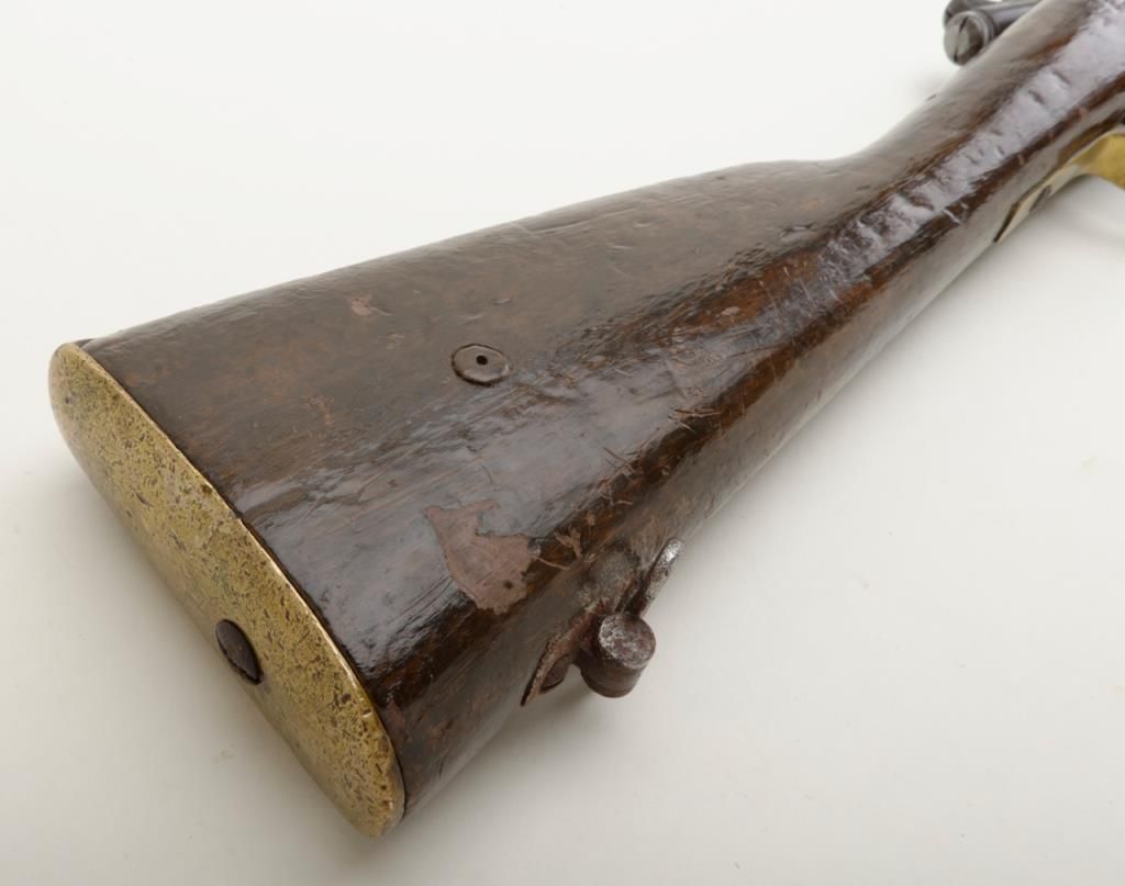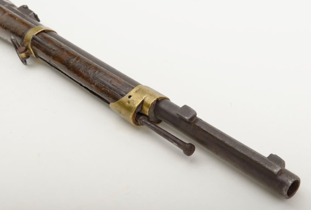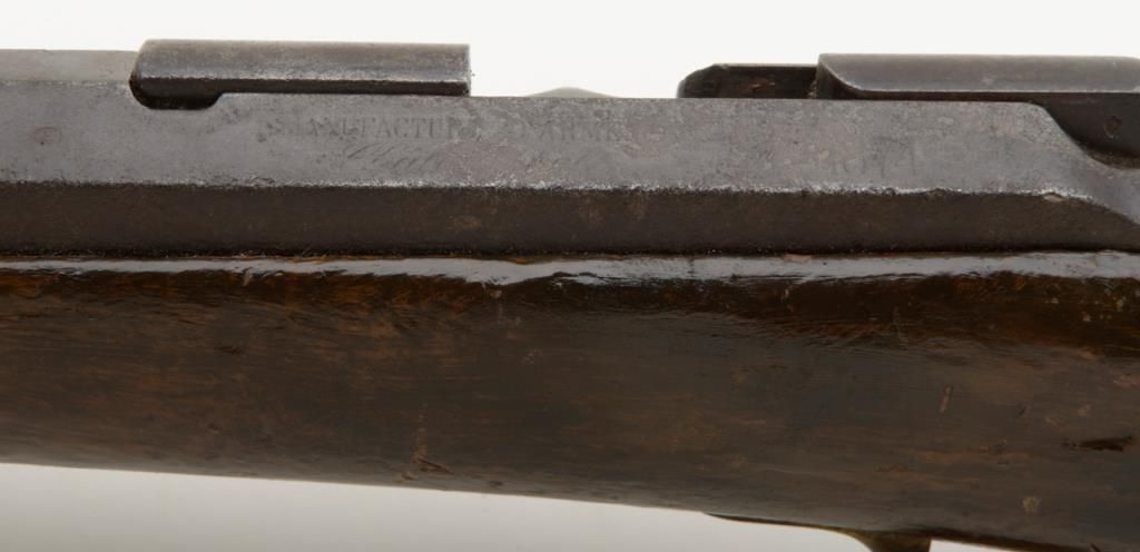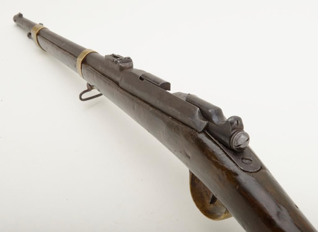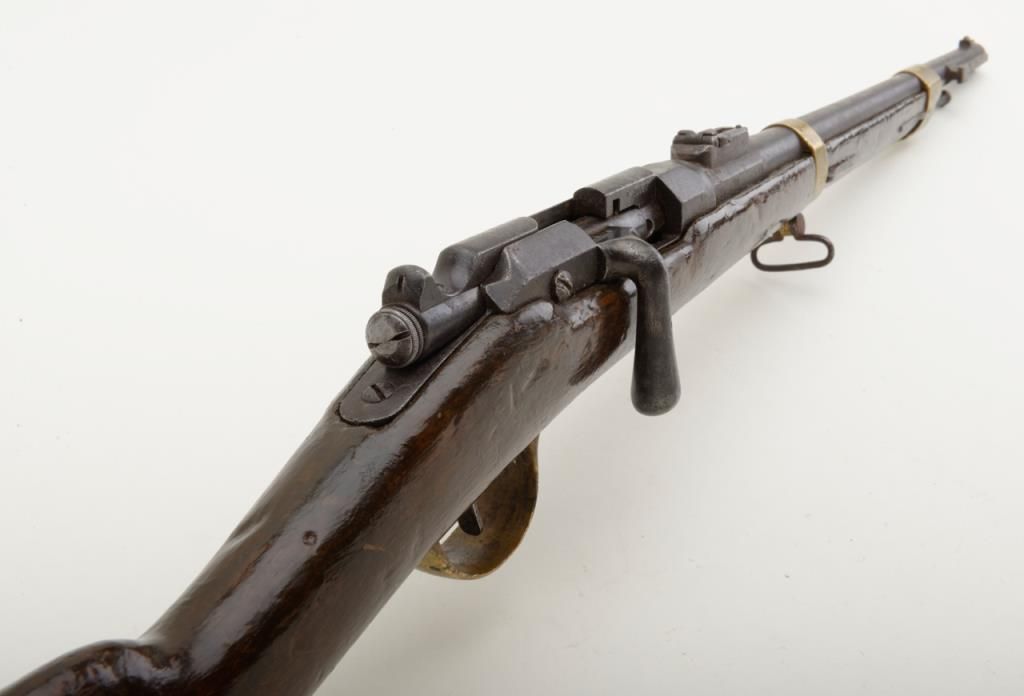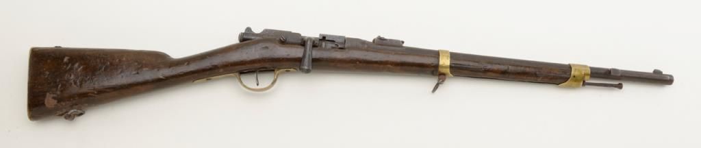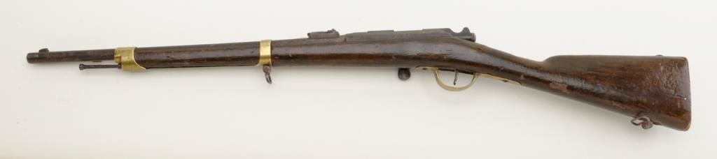 Mauser Model 1871 bolt action carbine, 11mm cal., 20” barrel with bayonet lug, brass bands, trigger guard and butt plate, wood stock in well-worn condition, dark patina on metal surfaces, dark bore, good action, wood has been heavily re-finished. (Antique). Est.: $250-$500.