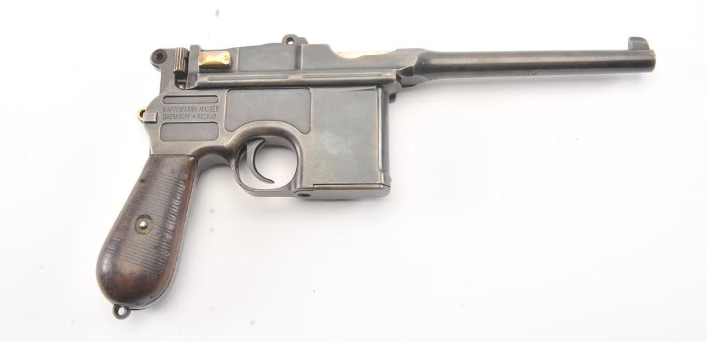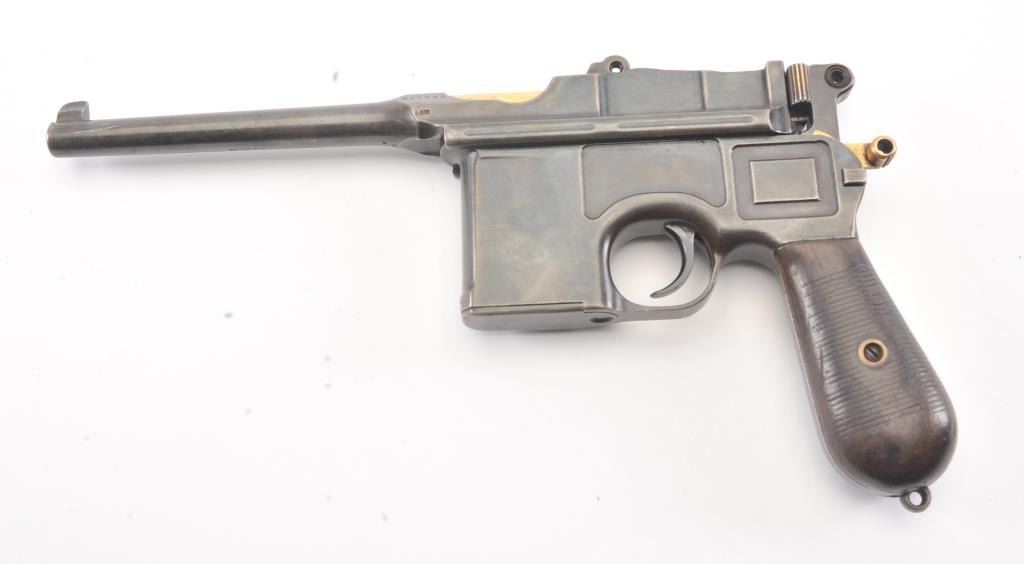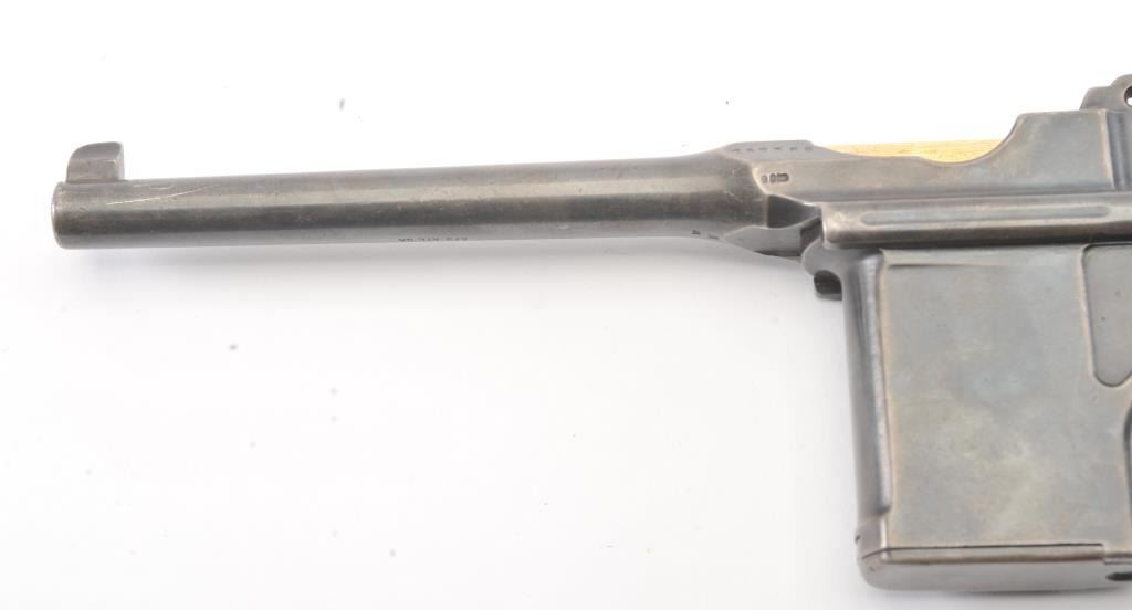 Mauser Model 1896 Broom handle Semi-Auto pistol in 7.65 (.30 Mauser) caliber, Serial #169386 with other mismatched numbers. Shows 50%-70% old re-blue arsenal type finish. Markings and edges are good, missing the rear sight. The bore is good and mechanically sound, Import marked under the barrel. The grips are in good condition with mars and dents from carry and use. Est.: $400-$800. (C+R/PPT).
