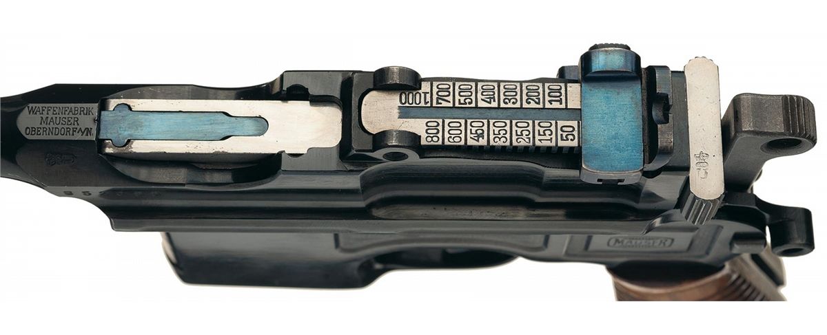 Blade front and tangent rear sights, graduated to 1000 meters, with the top of the chamber marked "WAFFENFABRIK/MAUSER/OBERNDORF A/N", a "crown/crown/U" proof on the upper left and the serial number on the left side flats. Standard two line marking address and "D.R.P.u.A.P." mark on the right side of the frame, with the milled panels, niter blue small parts, stock cut back strap, lanyard ring and 12-groove hardwood grips.