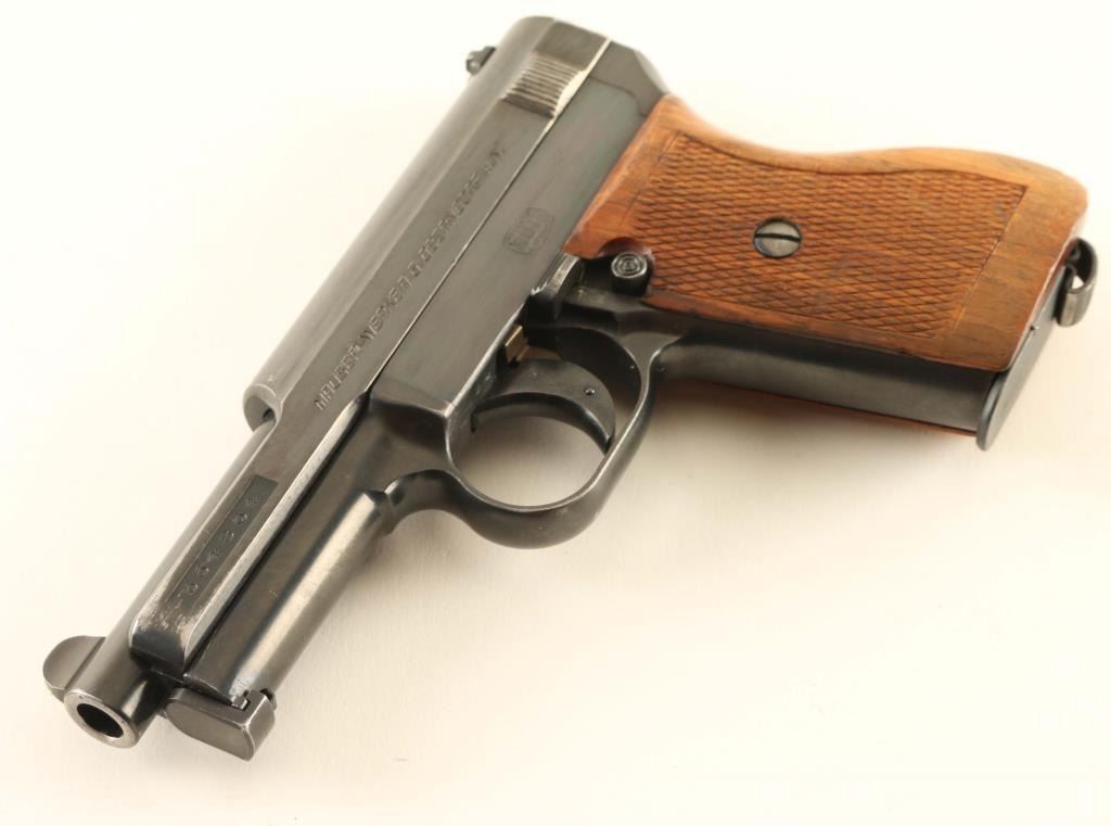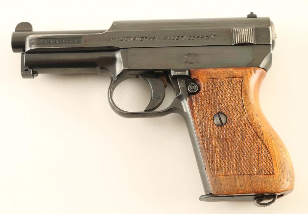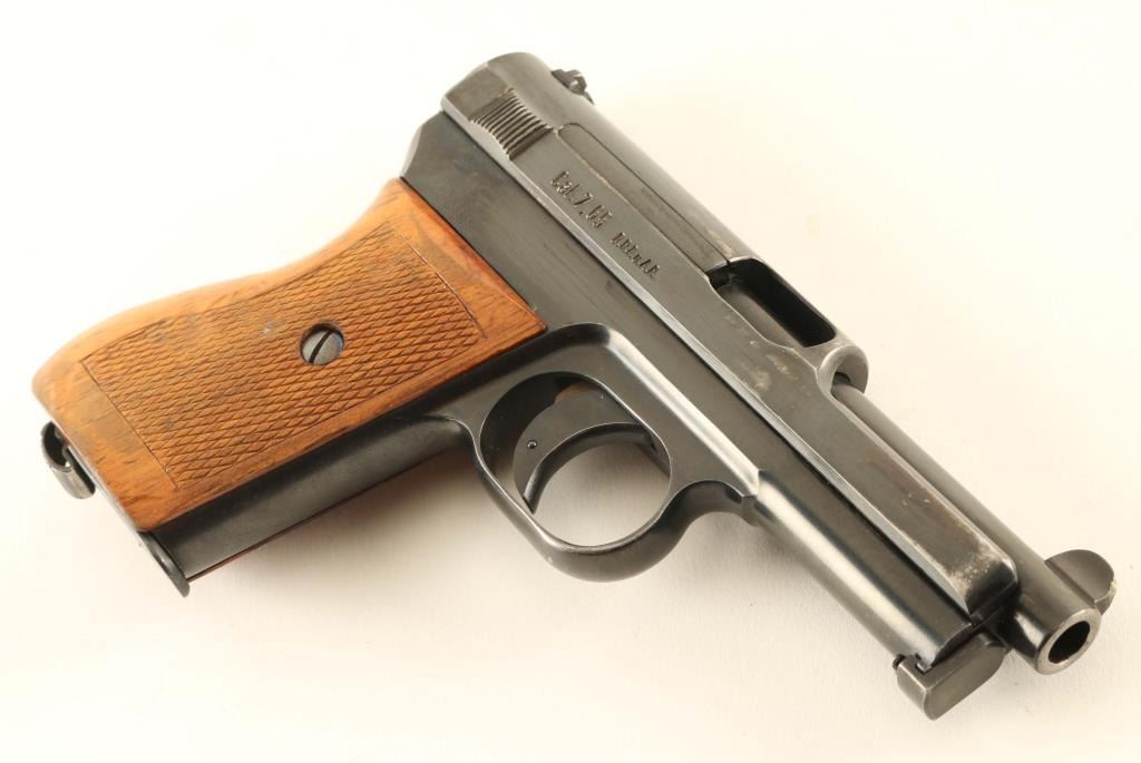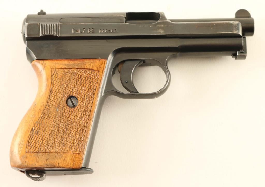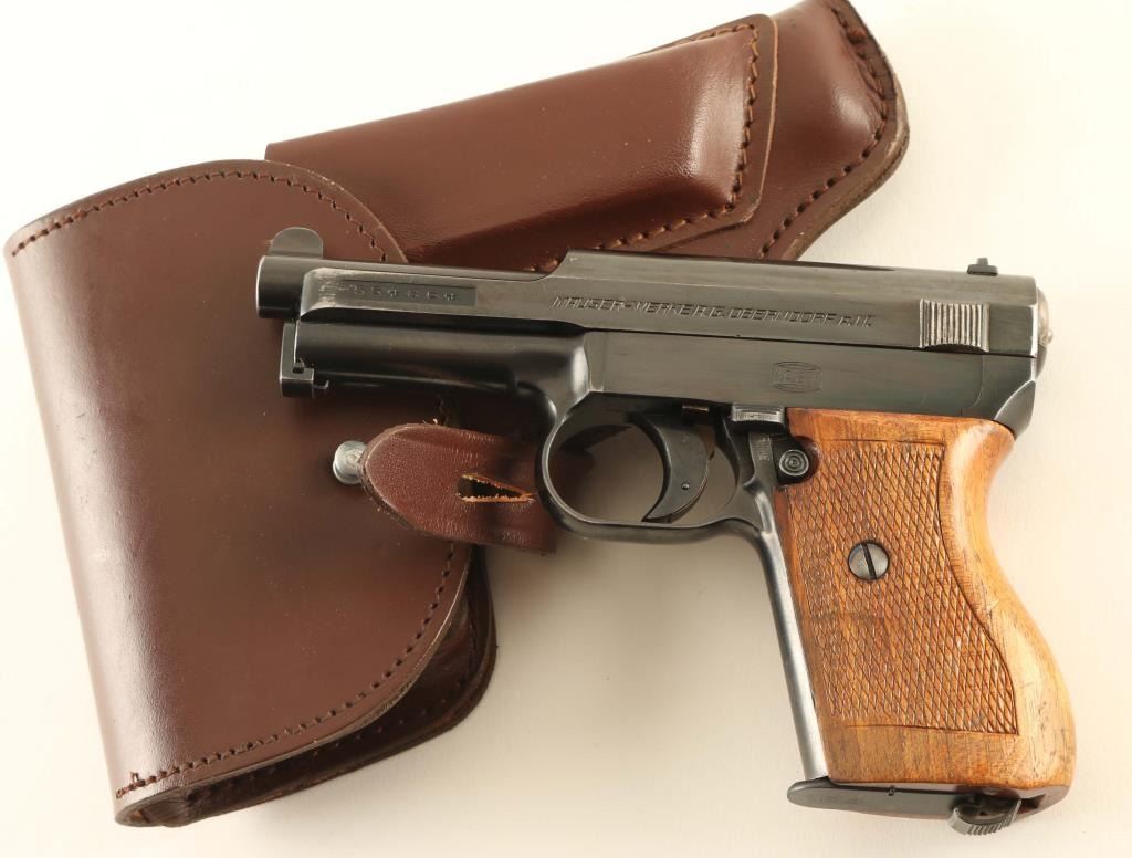 German semiautomatic pistol features approx 3.25" barrel, fixed sights, single action trigger, manual safety, heel type magazine release. Bore is very good condition, bright with sharp rifling, some tiny dark spots. Retains 90% blued finish, some bare metal on high spots, sharp edges, and scuffs to right side; appears to be reblued with few tiny pits under finish. Wood grips are in very good condition with some dents and some flattening of checkered points. Markings are typically crisp & even. Mauser banner on left side appears light struck or slightly polished with reduced detail. Right side of slide marked "DRPuAP" (indicates a patented design). No import marks observed. Includes one very good condition magazine and a very good condition russet color leather flap holster (fits but appears to be made for a different pistol). Attributed as US GI WWII Vet bring-back (no papers). Condition is NRA Very Good *** C&R Firearm ***