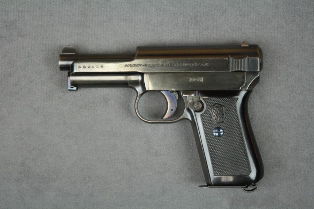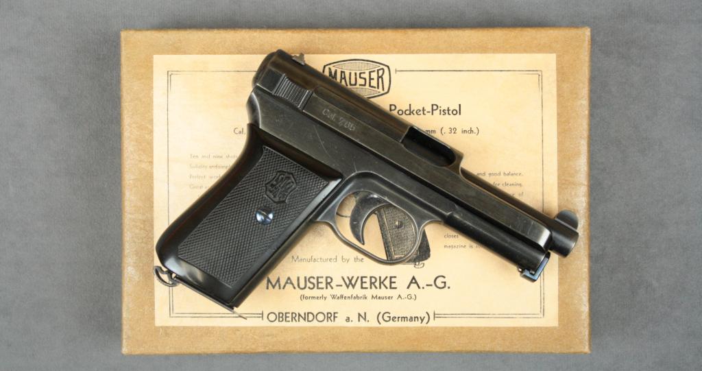Mauser Model 1934 semi-auto pistol with factory two piece cardboard box , one extra magazine, one box of ammo, instructions manual and misc. small parts, 7.65 cal., 3-1/2” barrel, black finish, checkeredplastic grips, #482495. This gun is in overall fine condition showing the majority of what appears to be an old quality refinish, very good bore, action, markings and grips. Est.: $300-$600.