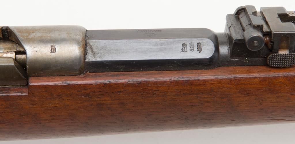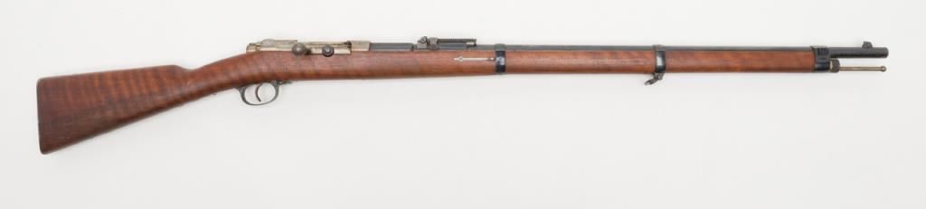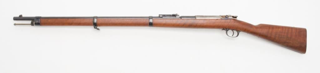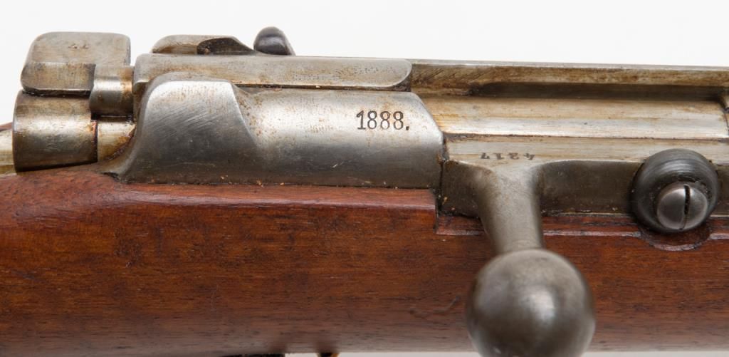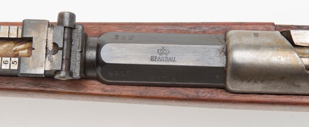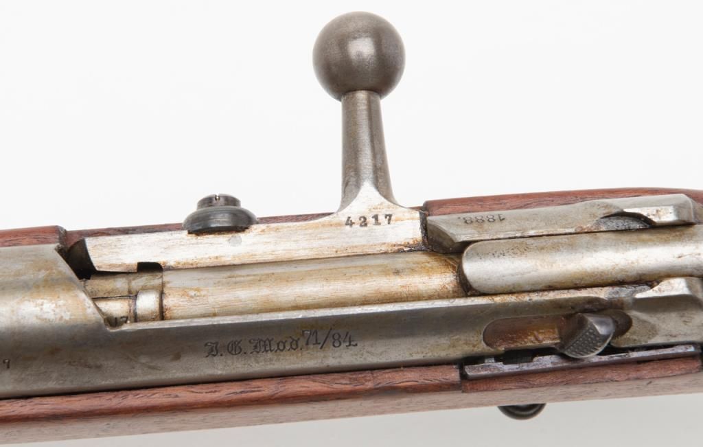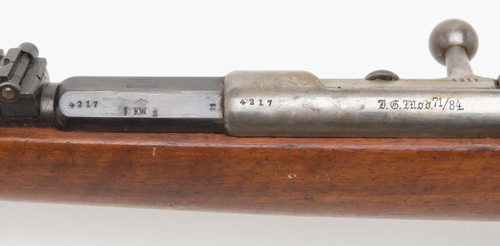Mauser Model 71/84, 11 mm bolt action military issue rifle in fine to excellent original condition serial number 4217. The barrel and bands show 95%-98% plus original bright blue with a coating of dried oil and grease which hasprotected the finish. The action shows an original arsenal bright and a coating of the same grease as does the butt plate. The stock is fine to excellent with a few minor storage bumps and scratches with excellent cartouches. The serialnumbers that are visible are all matching. The breech is marked “Spandau Arsenal”. All original small parts are retained and the bore is excellent to near mint. A strong 9.5 on 1 to 10 scale which when the grease is cleaned it may be a 9.8+. Anexceptional 71/84 Mauser. Est.: $600-$1200