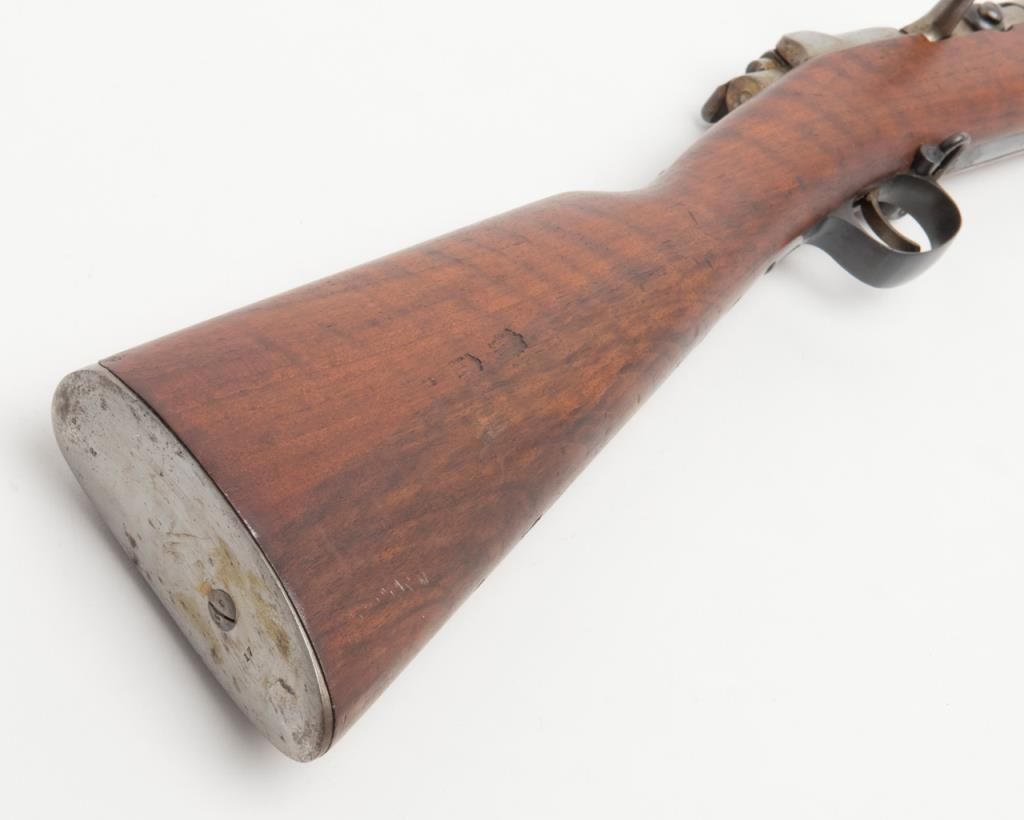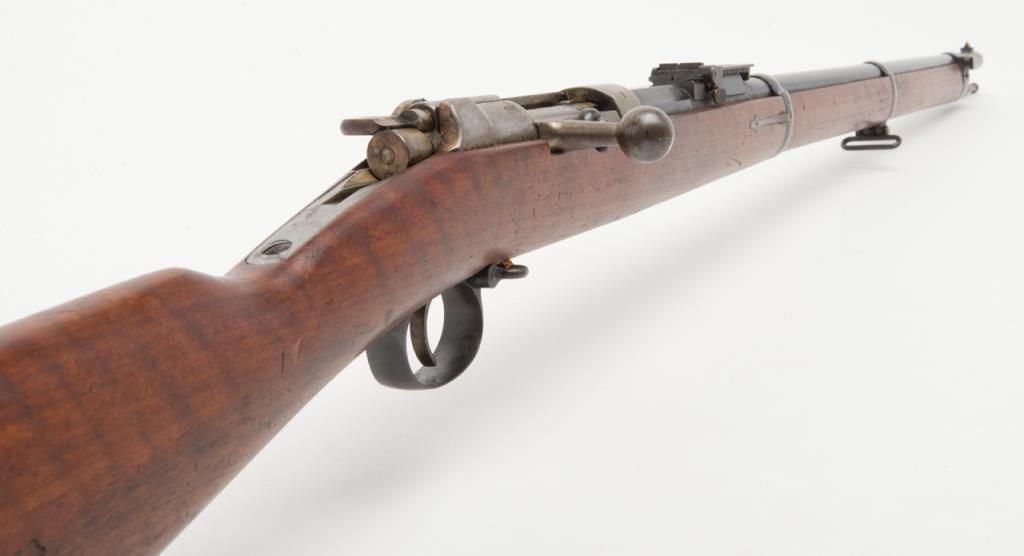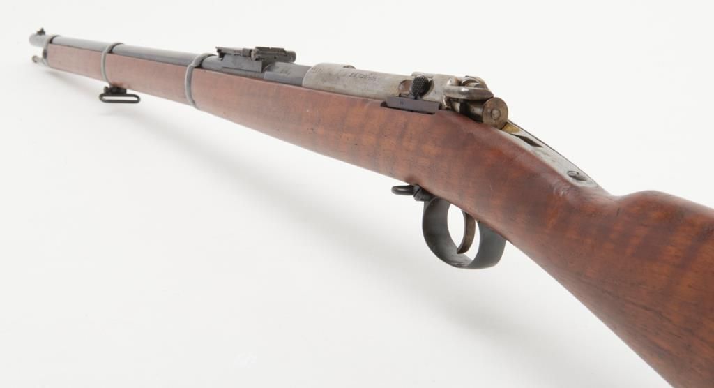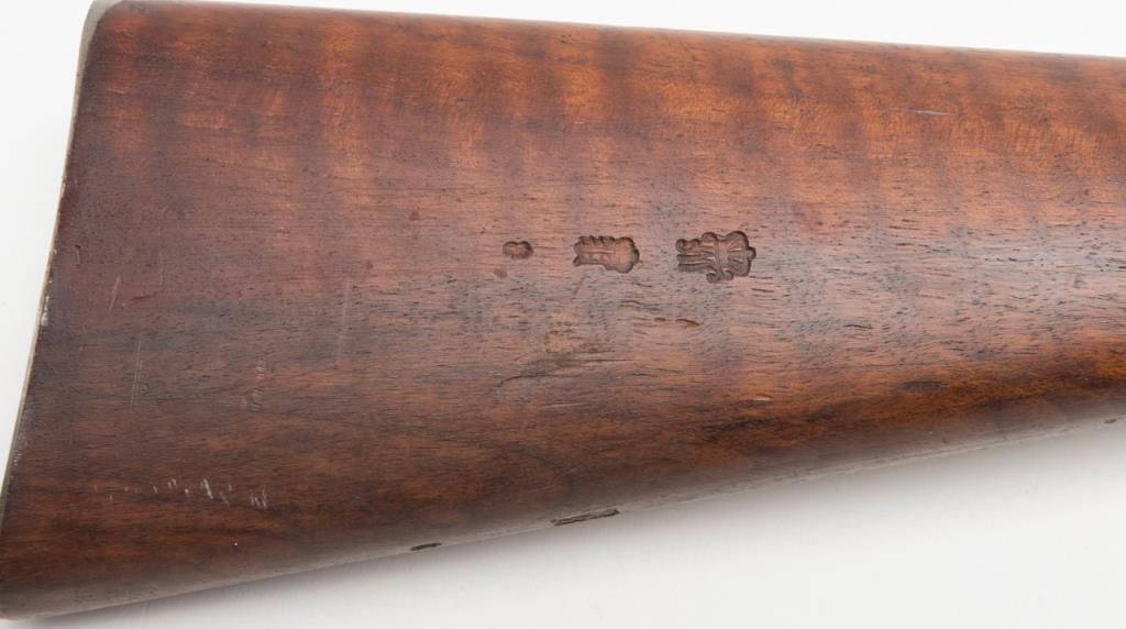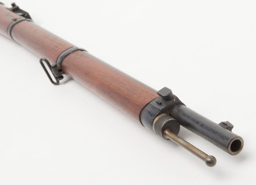 Mauser Model 71/84, 11 mm bolt action military issue rifle in fine to excellent original condition serial number 4217. The barrel and bands show 95%-98% plus original bright blue with a coating of dried oil and grease which hasprotected the finish. The action shows an original arsenal bright and a coating of the same grease as does the butt plate. The stock is fine to excellent with a few minor storage bumps and scratches with excellent cartouches. The serialnumbers that are visible are all matching. The breech is marked “Spandau Arsenal”. All original small parts are retained and the bore is excellent to near mint. A strong 9.5 on 1 to 10 scale which when the grease is cleaned it may be a 9.8+. Anexceptional 71/84 Mauser. Est.: $600-$1200
