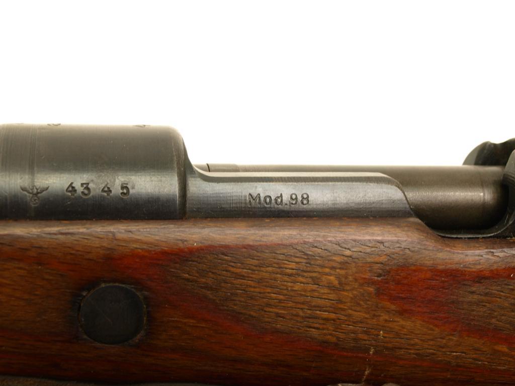 with 23 1/2" barrel, marked "ar 44" indicating Mauser Werke 1944, Waffenamt stamp top of receiver ring, left side stock stamped "484", original/period leather sling intact. Very good overall condition. Good action & bore. Mfg 1944. FFL required.