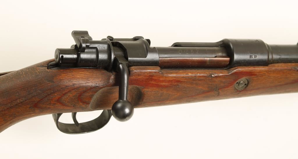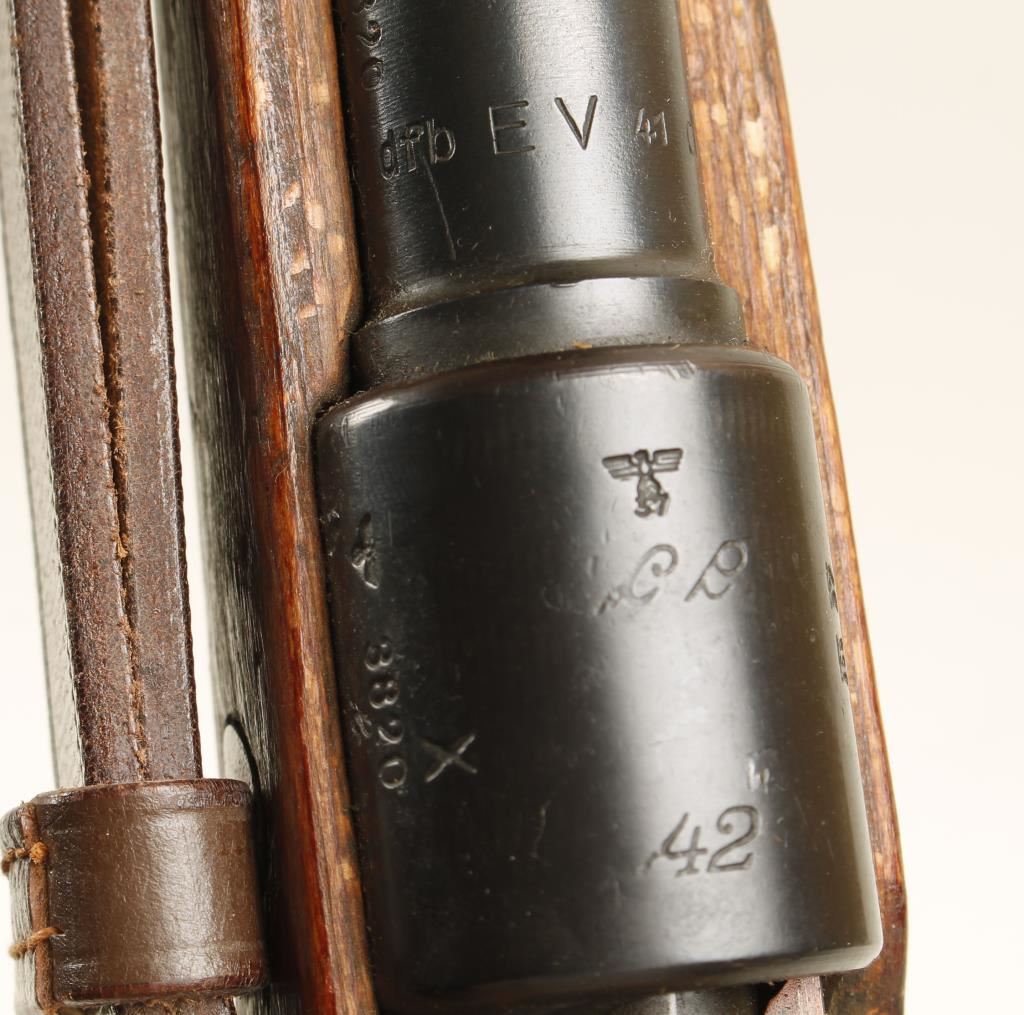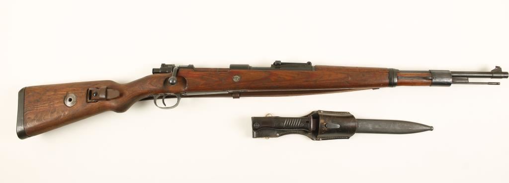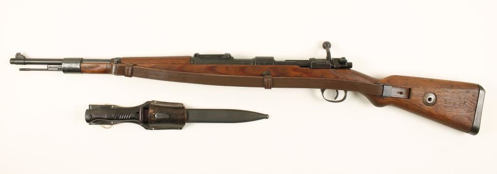 German military bolt-action rifle with a 24" barrel. Import marked. "X" marked for Russian capture and re-finish. Bluing has a little edge wear. Serial numbers of receiver and barrel match. Others do not. Bore is shiny. Action works well. Stock is laminated with numerous dings but has a Waffenamt cartouche and is numbered to the receiver. Includes a bayonet with scabbard and frog. Condition is good. *Modern Firearm*