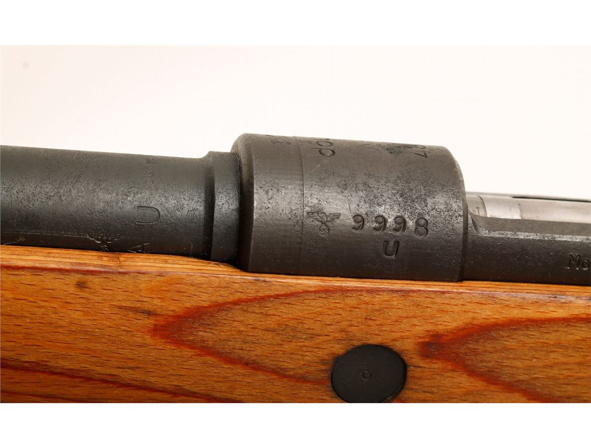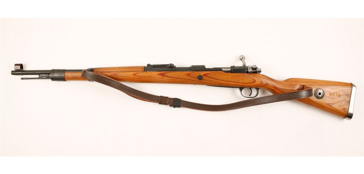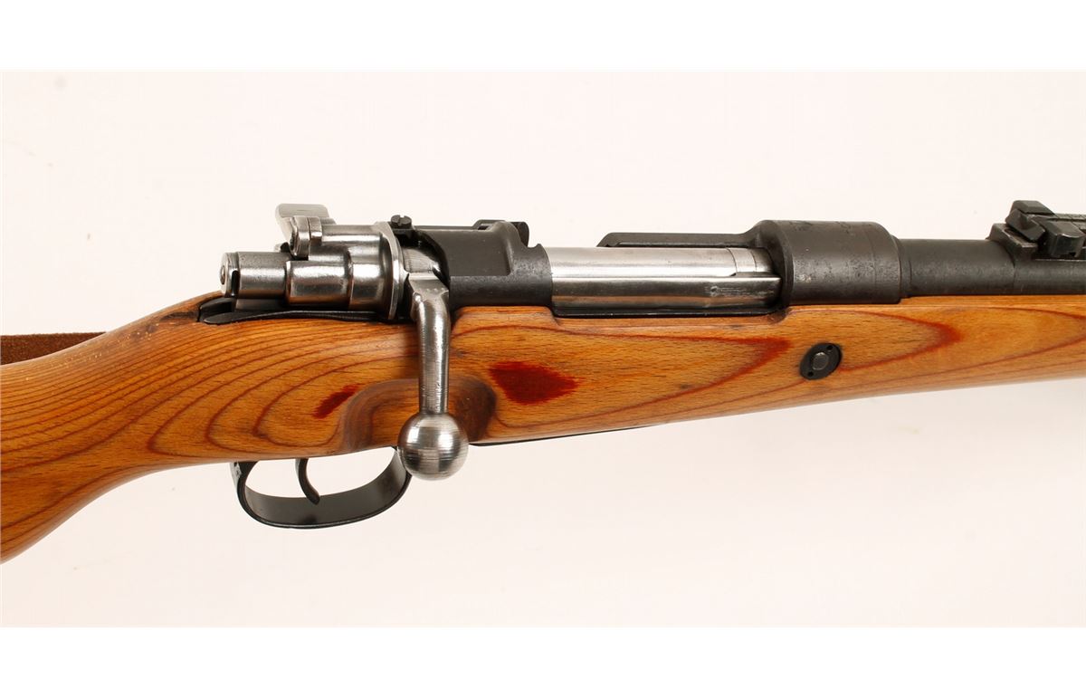 Mitchell's Mausers rifle. Blued bolt-action refinished Russian capture rifle with a 24" barrel, wood stock, and leather sling. All visible numbers match except the forend cap, rear sight and base and buttplate. Metal finish on barrel and receiver is splotchy with refinish over pitting. Floorplate is brighter and bolt is bright and in-the-white. Receiver ring is marked with "dou 43" and the Russian cross. Made at Waffen-Werke Brunn in 1943. Laminated wood stock is refinished and has been recently stamped with the receiver serial number. There were some stamps on the right side of the butt that seem to be waffenamts. One seems to be a waffenamt over an "H". Bore is dull with strong rifling. Action works well. Leather sling has a waffenamt. Includes Mitchell's box and documents. Condition is good.