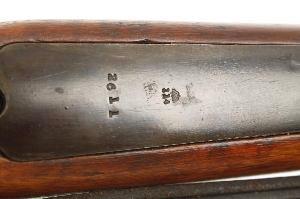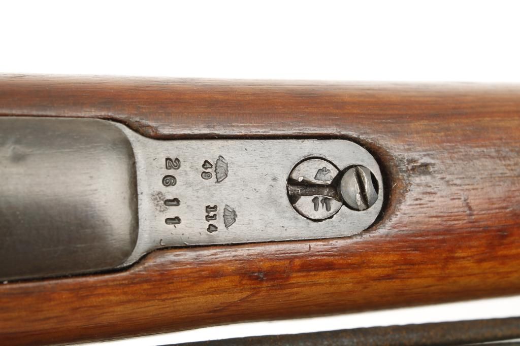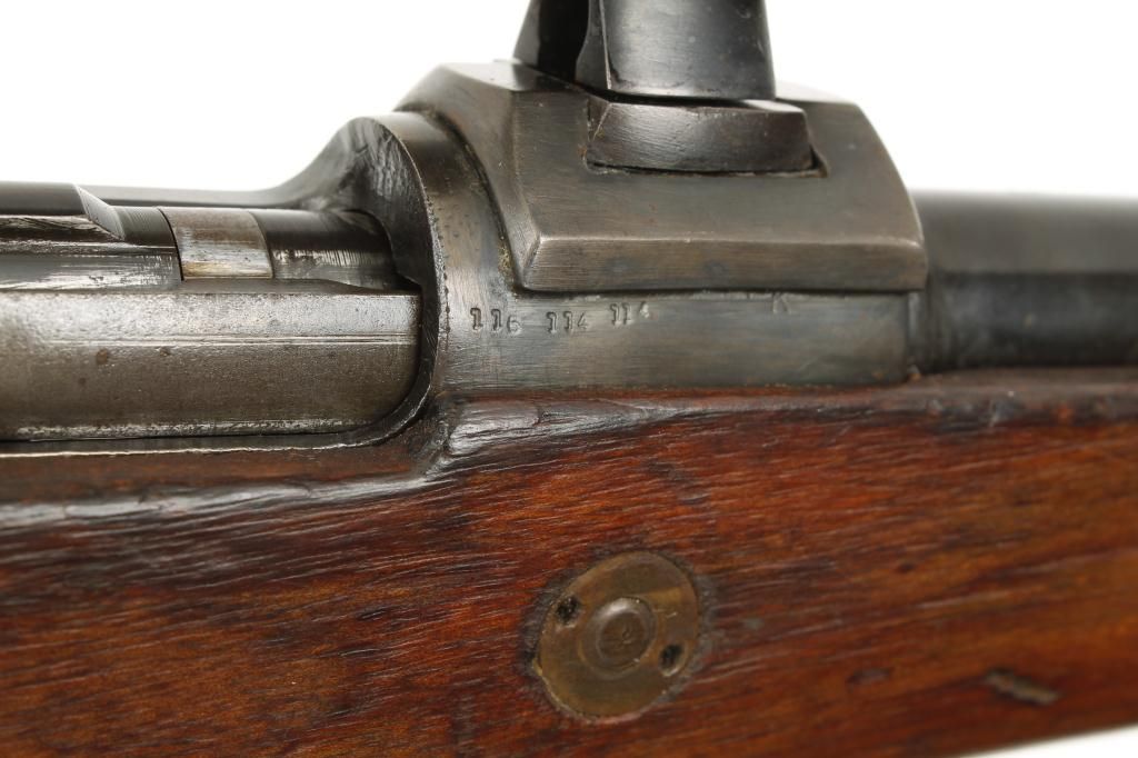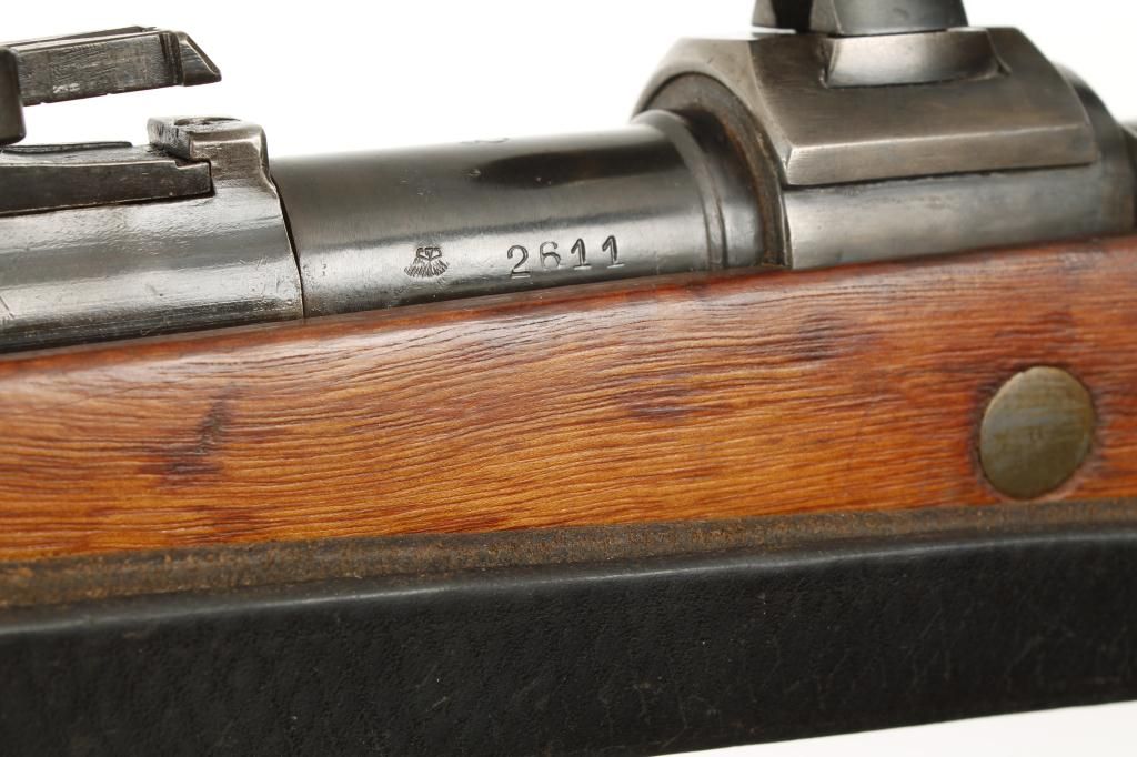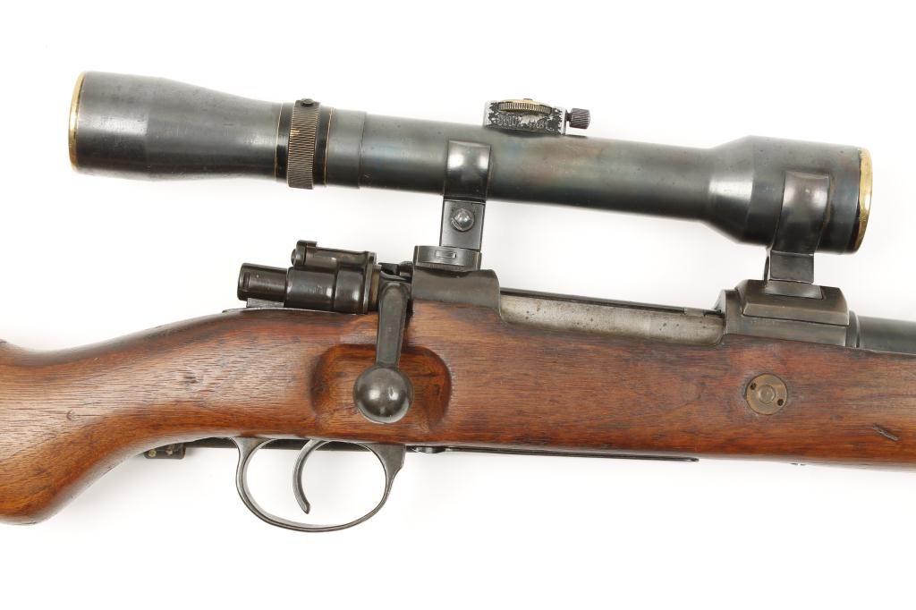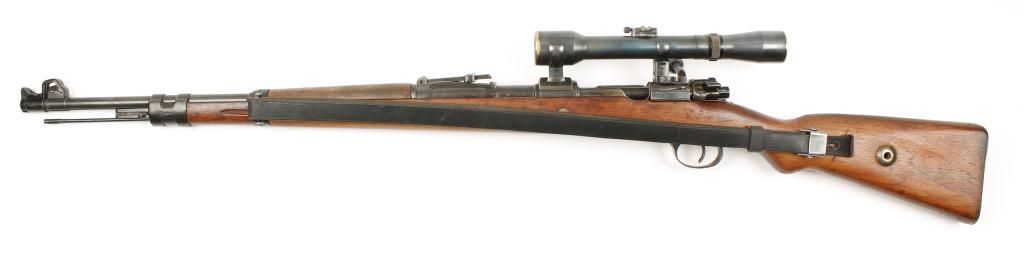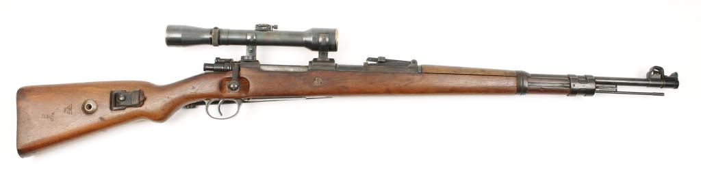 Mauser Model 98 bolt action snipe’s rifle mounted with quick detachable scope marked “W. Bischoff, Braunschweig” on one side and “Dinox 4 X 81” on the other side, displaying very good optics, 7.92mm cal., 24-1/2”barrel, military blue finish, wood stock, leather sling, #2611. This gun is in overall very good condition with all matching visible numbers, flip-up muzzle cover, nazi marked stock that is also numbered to the gun and in good condition, very good bore, crisp action. It is very unusual to find a sniper’s rifle with all matching numbers including the bolt as knowledgeable collectors are aware German marksmen often utilized severalbolts with their rifles depending on field conditions, etc.; a very desirable military specialty firearm! Est.: $2,500-$5,000.