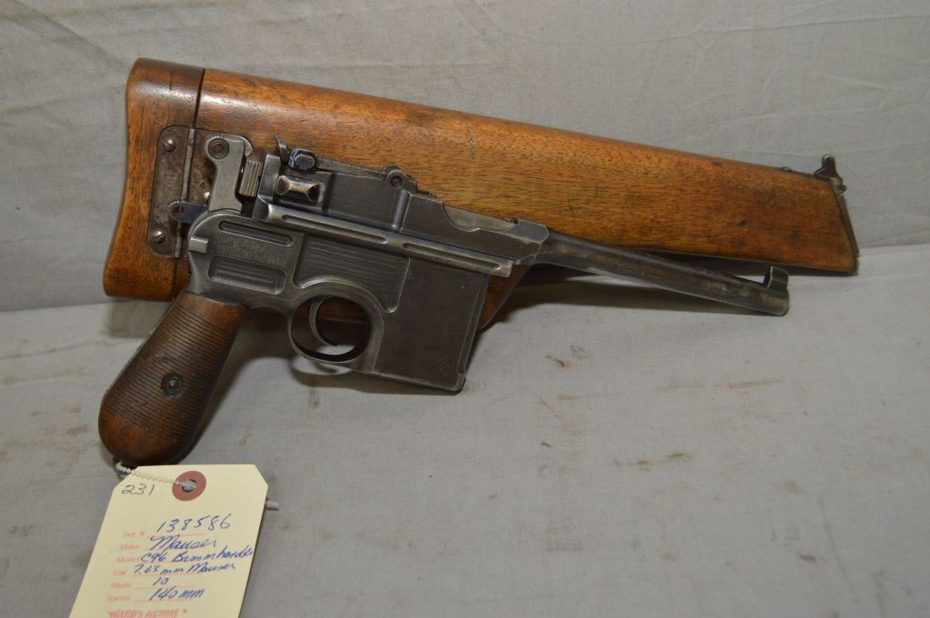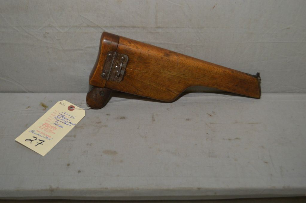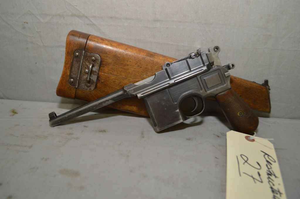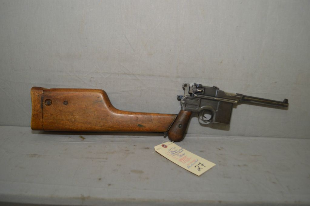 Mauser Model C96 Broomhandle 7.63 MM Mauser Cal 10 Shot Semi Auto Pistol w/ 140 mm bbl [ blued finish starting to fade with some holster wear, all matching numbers including the wooden shoulder stock Numbered 586, small ring, sight marked 50 - 1000, 23 groove grips, missing the lanyard ring but has the stud ] Ser # 138585 Restricted Cert # Old L - 134171