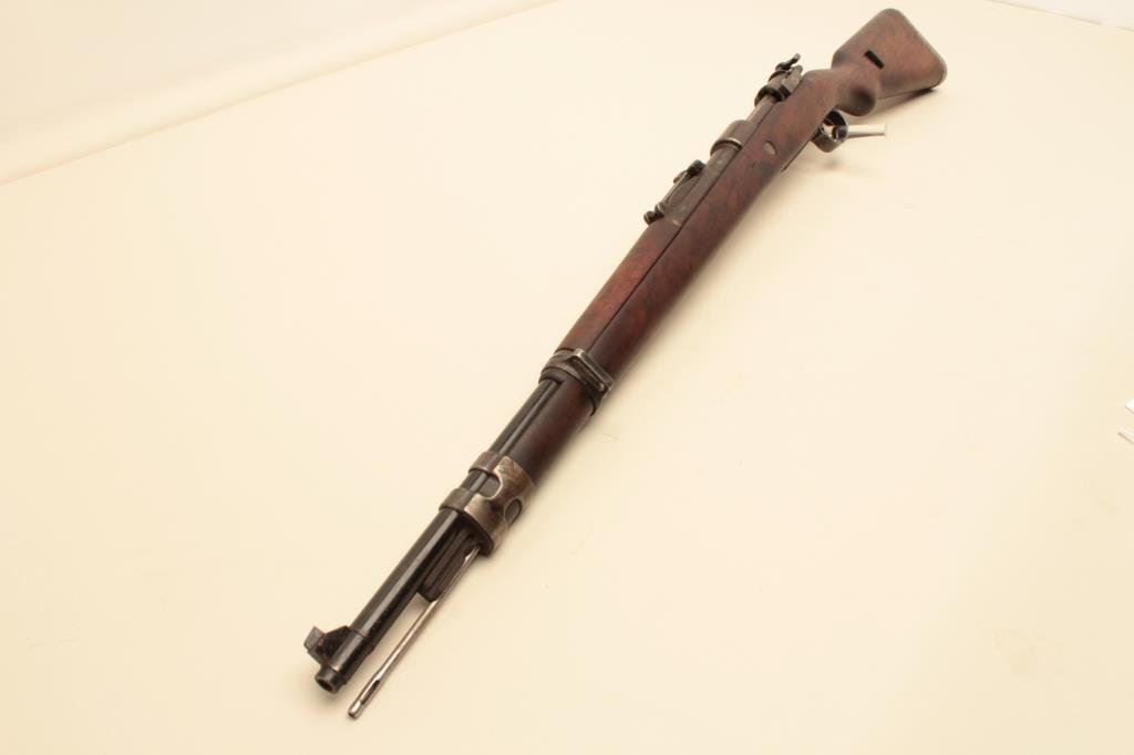 mm caliber, Serial #771. The rifle is in good overall condition with a 23” barrel with a ramp post front and military tangent style rear sights. The barrel retains the majority of its military finish with German proofs and some light to moderate surface erosion evident. The receiver is also German Eagle proofed in several locations and shows considerable original military finish. The front ring is marked “AMBERG”, dated 1906 The rifle retains the bayonet lug and cleaning rod. The smooth wood stock is in good condition showing moderate use with dents, compressions and a 1 ½” lateral crack at the butt. The butt stock has cartouches on both sides and ends with a smooth, steel butt plate. The bore is fair, the action crisp and markings are sharp on this pre-WWI era Mauser. Est.: $500-$1,000. (C+R).