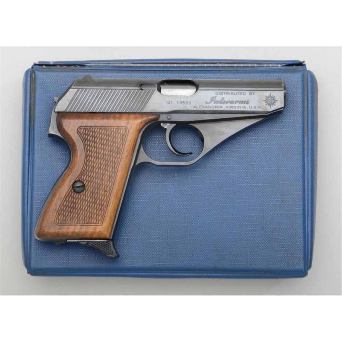 Mauser Model HSc DA semi-auto pistol, German-made for Interarms, .380 cal., 3-1/4” barrel, black finish, checkered wood grips, #0113599. This gun is in overall excellent condition showing approx. 99% originalfinish, fine bore, action, markings and grips; accompanied with extra magazine and instruction manual all in blue plastic hard box. Est.: $150-$300.
