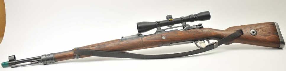 Mauser Model K98 bolt action rifle, 8 x 57 caliber, Serial #6887u. The rifle is in very good overall condition with a 24” barrel with a hooded front and military tangent style rear sights. The rifle retains asignificant amount of military finish with Nazi proofs and acceptance marks. The right side of the barrel is import marked at the muzzle and the bolt has been modified to accommodate scope mounting. The smooth woodstock shows moderate use with dents and mars consistent with service use. The rifle is topped with a BSA 3 x 9 variable power scope and includes a period leather military style sling. The bore is fair, the actionfunctions and the markings are sharp. Est.: $350-$700. (C+R).
