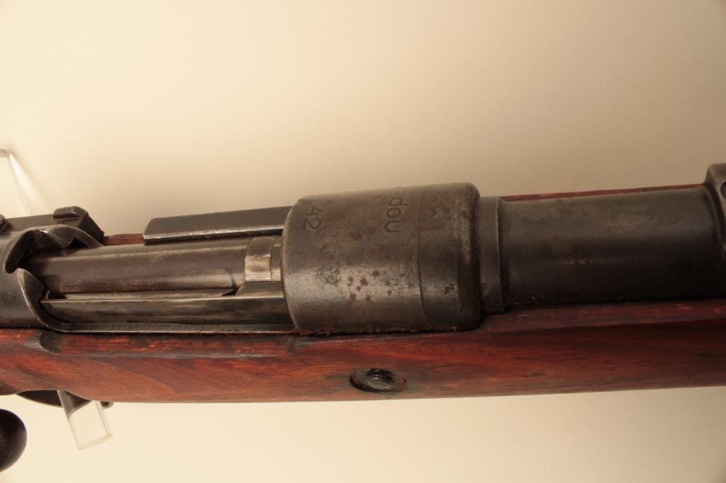 caliber, Serial #4494. The rifle is in very good overall condition with a 24” barrel with a hooded post front and military tangent style rear sights. The barrel retains the majority of its military finish with Nazi proofs and some light surface erosion. The receiver is also Nazi proofed in several locations. The front ring is marked “dou”, dated 1942 with all matching visible serial numbers. The rifle retains the bayonet lug and cleaning rod. The smooth wood stock is in very good condition showing primarily handling and storage marks. The butt stock has a cartouche on the left side and ends with a smooth, steel butt plate. The bore is good, the action crisp and markings are sharp on this WWII era Mauser. Est.: $500-$1,000. (C+R).