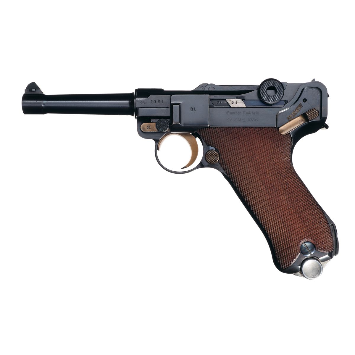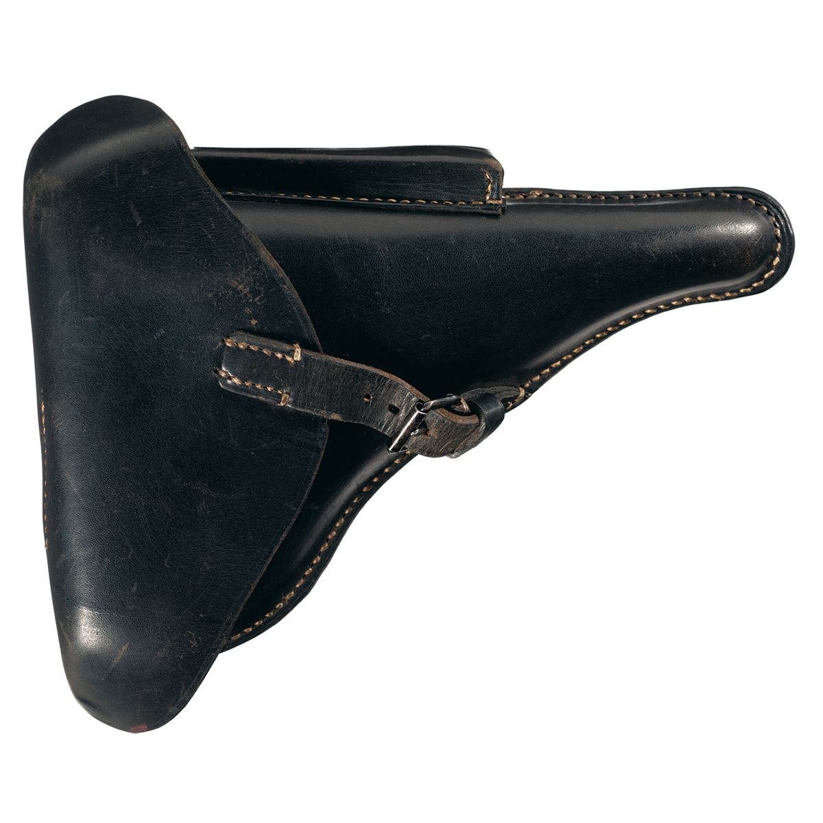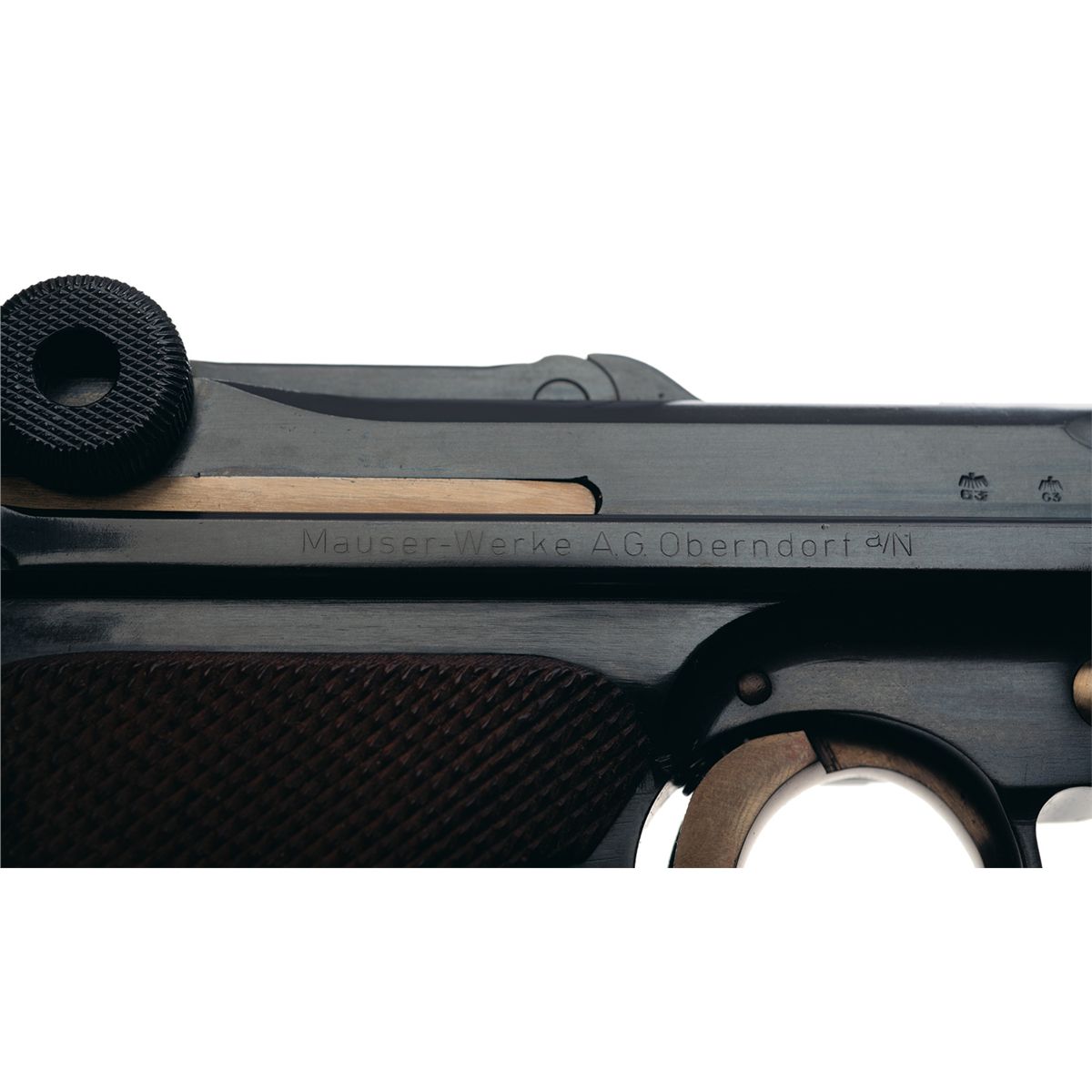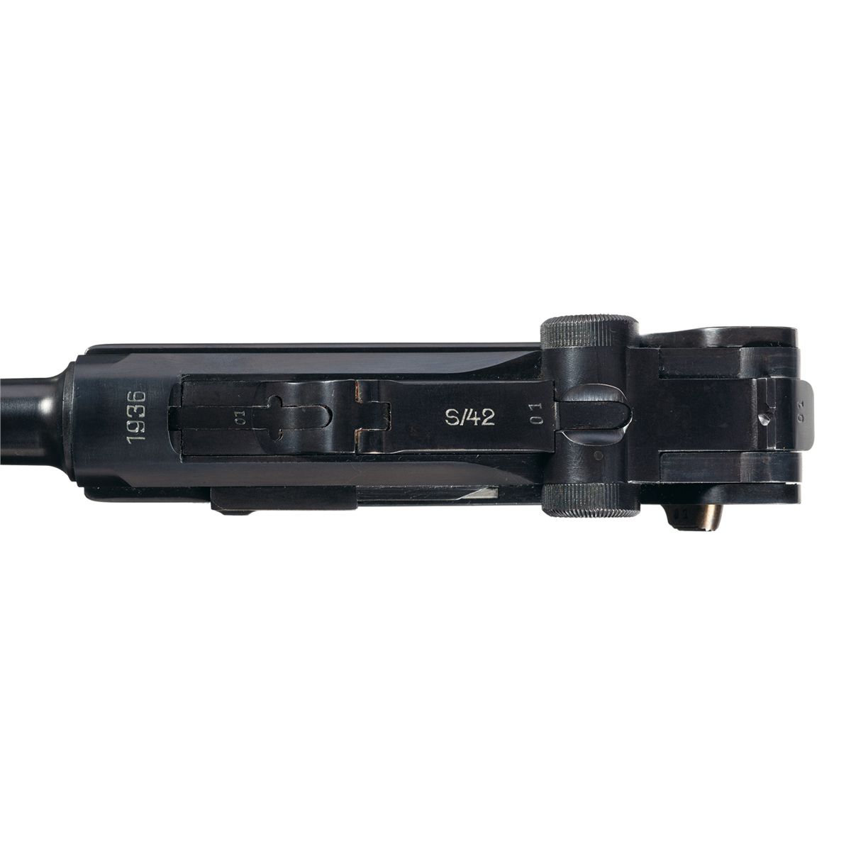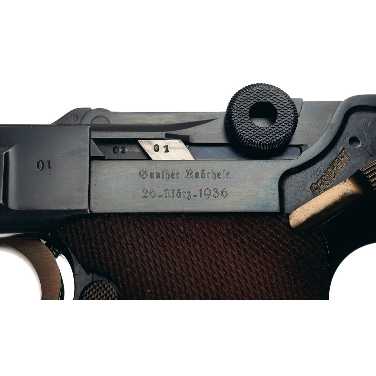 This is an interesting example of a early 1936 "S/42" P.08 Luger that has a presentation inscription on the left side of the frame. The top of the chamber is dated 1936 and the front toggle is marked "S/42", the wartime code for the Mauser factory. The left side of the frame has a two line custom presentation inscription. The inscription reads: "Gunther Rnucheim/ 26 May 1936" and the right side frame rail is marked "Mauser Werke A.G. Oberndorf a/N". The right side of the barrel extension is marked with a eagle/63 and eagle firing proofs and the left side has only a single "Crown U" proof, which is also stamped on the underside of the barrel. The luger has the correct safety and extractor markings and is complete with two unmarked nickel plated magazines with an aluminum base. The bases of both magazines have the serial number ground off and are now marked with a single Crown U commercial proof, the small letter "m" that corresponds to the serial number over a single eagle 63 Waffenamt proof. This Luger is complete with an excellent 1936 dated smooth black leather holster that is marked on back "Kern Klagerscie/1936 Berlin" over a single eagle WaA Waffenamt proof. The holster has a reproduction WWII German takedown tool inside that has a small eagle 63 Waffenamt proof.