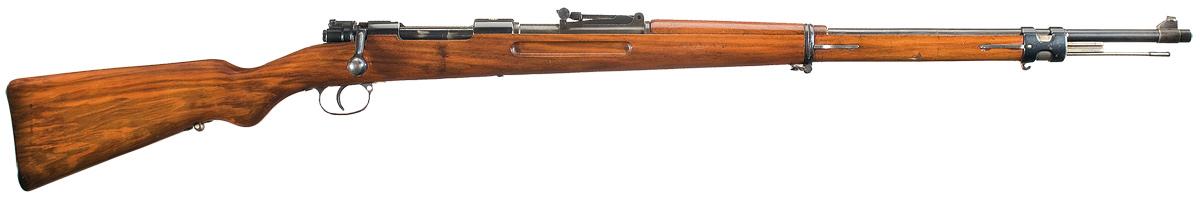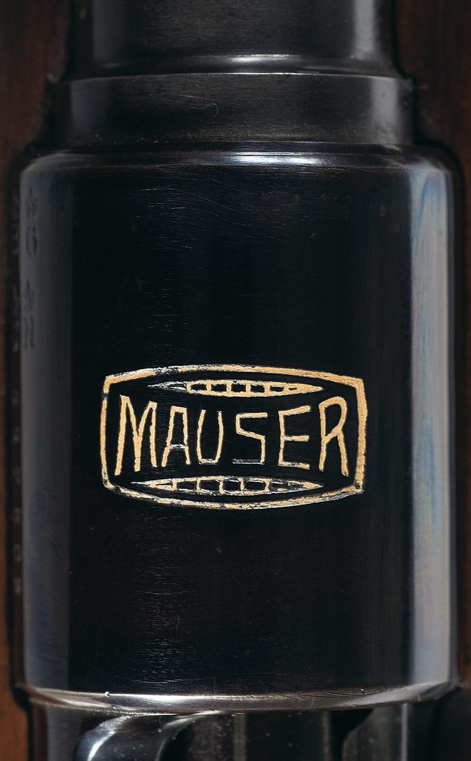 Single shot version with a solid, no thumb cut out receiver with single cartridge loading tray. Blade front and fully adjustable tangent rear sights, with the caliber markings on the left side of the barrel, "crown/ letter" proofs on the chamber near the Mauser banner, and the Oberndorf address on the sidewall. Milled components, with matching numbers on the bolt components and takedown catch. Smooth straight grip stock, sling bases and a flat buttplate.