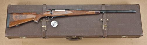 Mauser Oberndorf model 1898 – 1998 commemorative big game sporting rifle in .416 Rigby caliber, serial #R077/100. One of approx. 100 produced. This rifle shows a 26” heavy round barrel, African type three-leaf folding rear sight, select checkered burl wood stocks, with rosewood forend cap, hard-rubber recoil pad, double square bridge factory long action, in unused condition in presentation grade luggage type case with serial numbered original target. Rifle in excellent to new condition, 99% to new, just slight handling, minor storage, no evidence of firing. The rifle shows excellent German quality workmanship throughout. From the Robert Petersen estate. Est: $2,000 - $4,000
