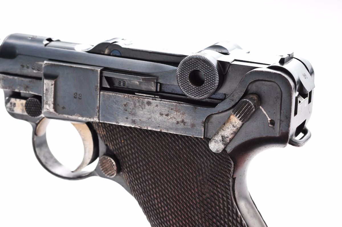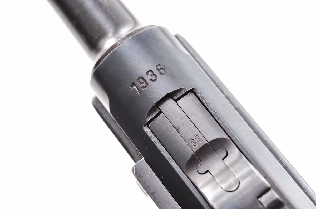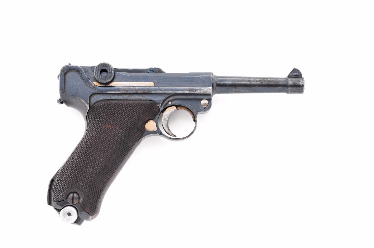 Mauser P.08 Luger, S/42 code 1936, # 4988n, 9mm, 4'' barrel, blue finish, checkered walnut grips, with ''122'' unit marked magazine. Condition is good retaining approx. 70% original rust blue with surface corrosion to both sides of the barrel and frame. Straw parts have faded to grey. All matching numbers except grips and magazine. Grips are very good with slight flattening to the checkers. Action is tight, bore is good with light frosting in the grooves. Est.: $1,000-$1,500. (C&R/PPT)