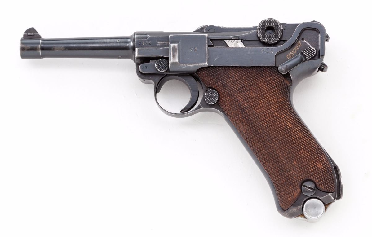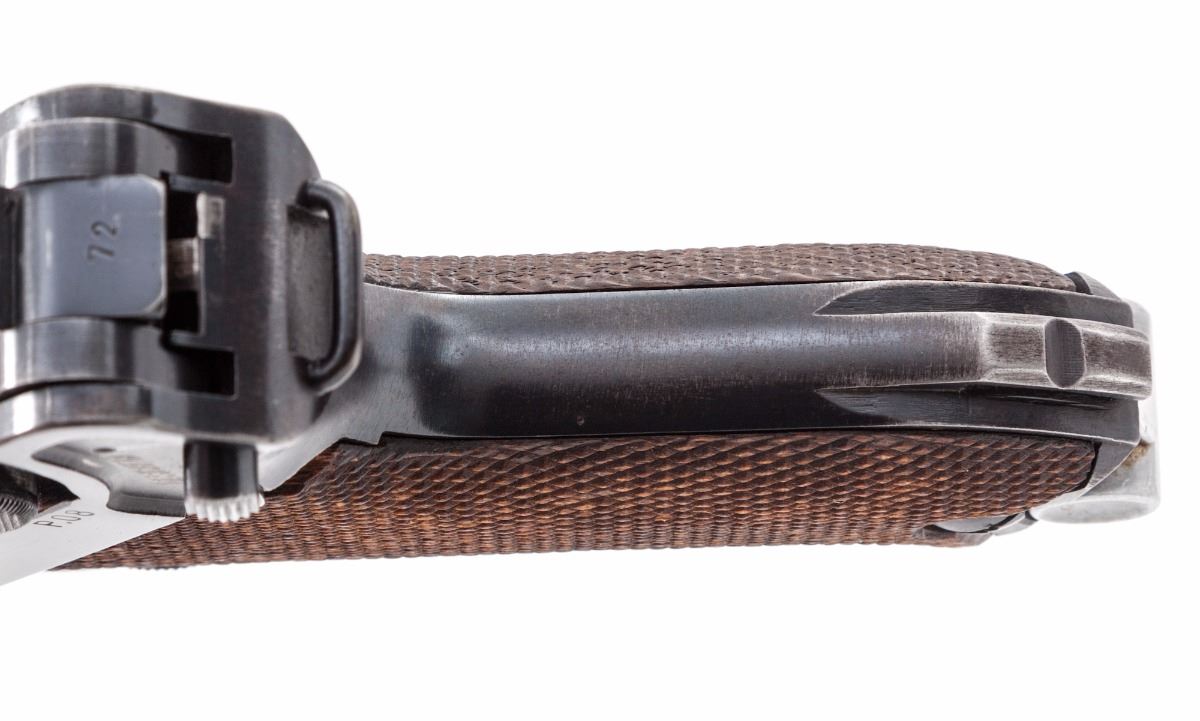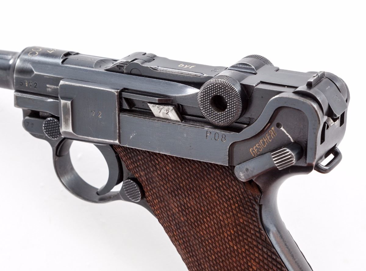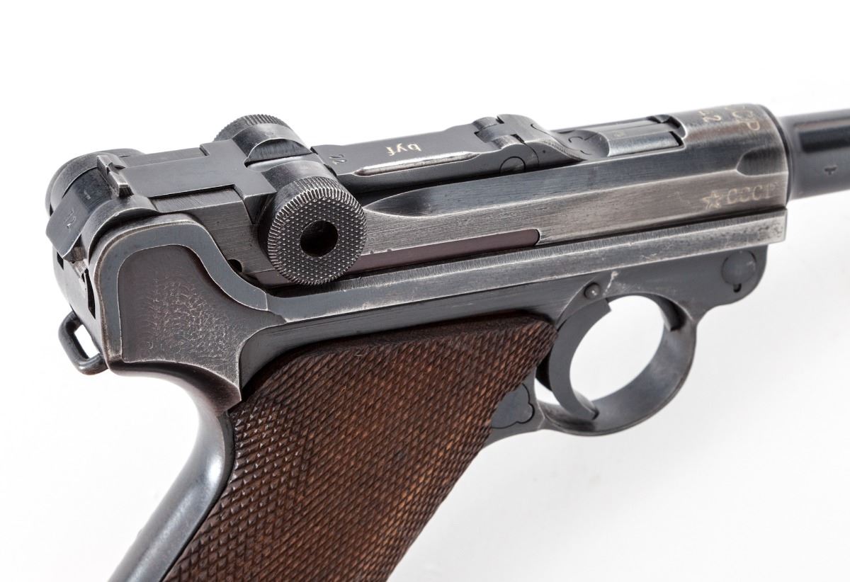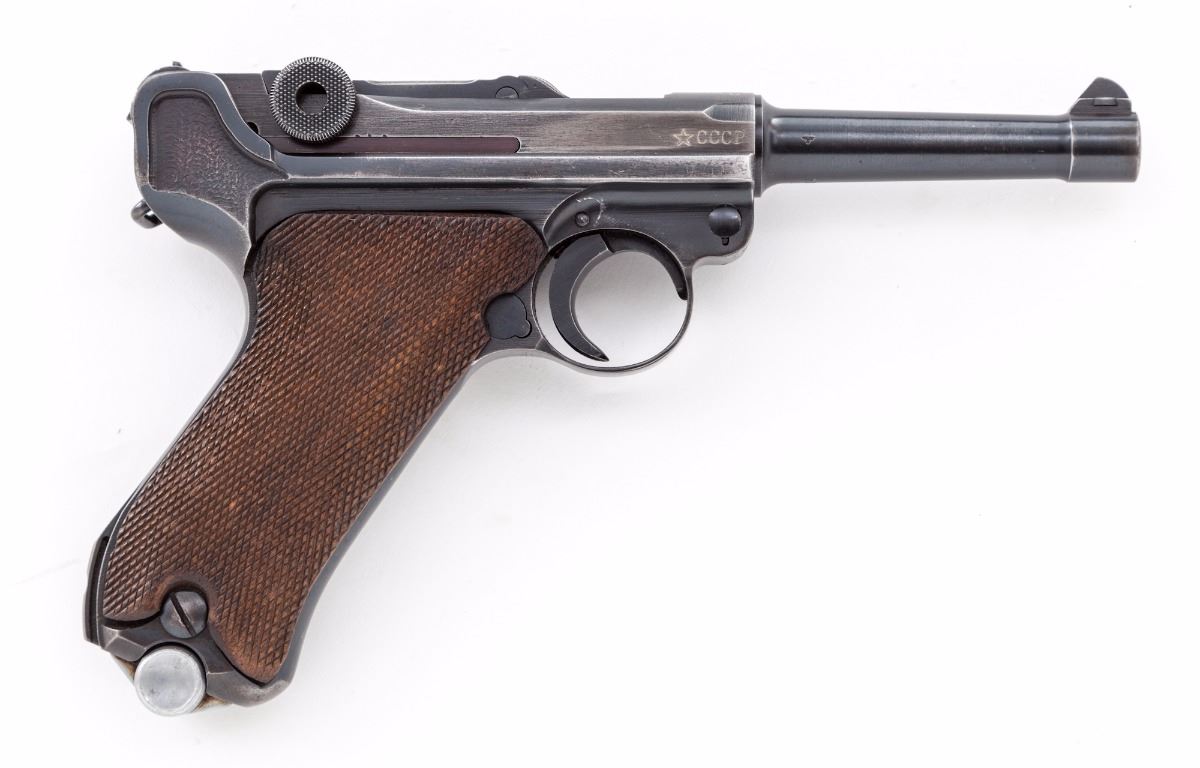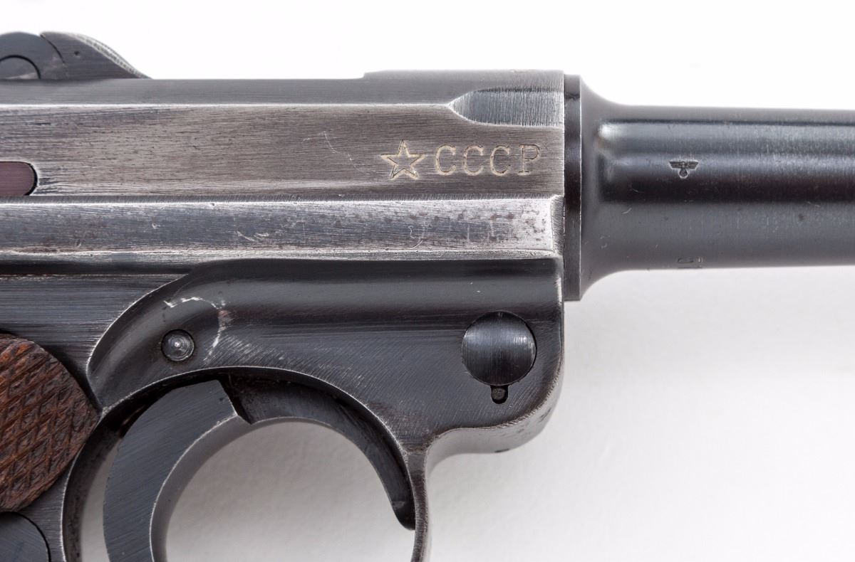 Mauser Model P.08 Semi Automatic Pistol (byf/42), #5172e, 9mm, 4'' barrel, blue finish, checkered walnut grips, marked CCCP over chamber and ''CCCP/*'' on right side of barrel extension, with one unmarked blue-bodied magazine; aluminum base is marked ''S/42'' and ''(eagle)/63''.   Condition is excellent as re-marked retaining approx. 90% of its original bluing with slight loss to the stock lug. All serial numbers match, except grips, which appear to be replacements.  Chamber has been re-stamped with the Russian CCCP and the firing proofs and inspection marks have been removed from the right side of the barrel extension and stamped with a star and CCCP.  The stamps appear to be professionally done, and while opinions vary as to their authenticity, this is still an excellent example of a Mauser byf /42 pistol.  Action is tight, bore is very good with slight roughness to the grooves.  Est.:  $1,200-$1,800.  (C&R/PPT)