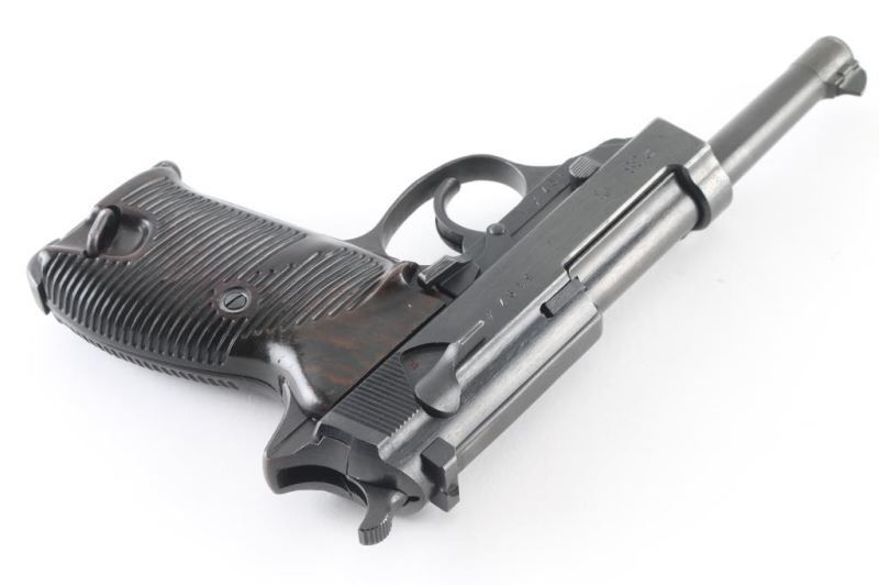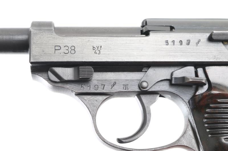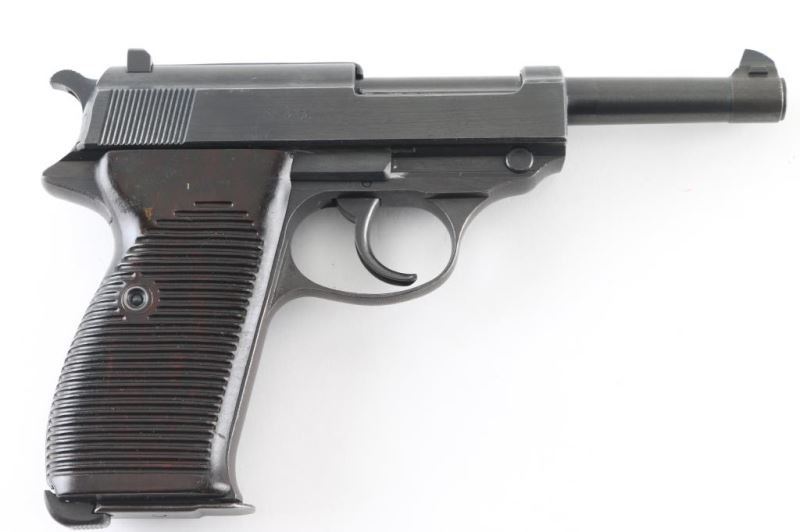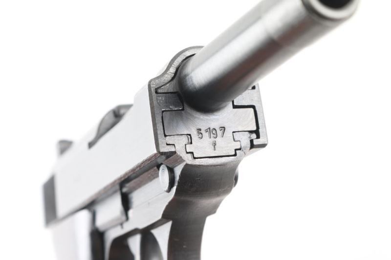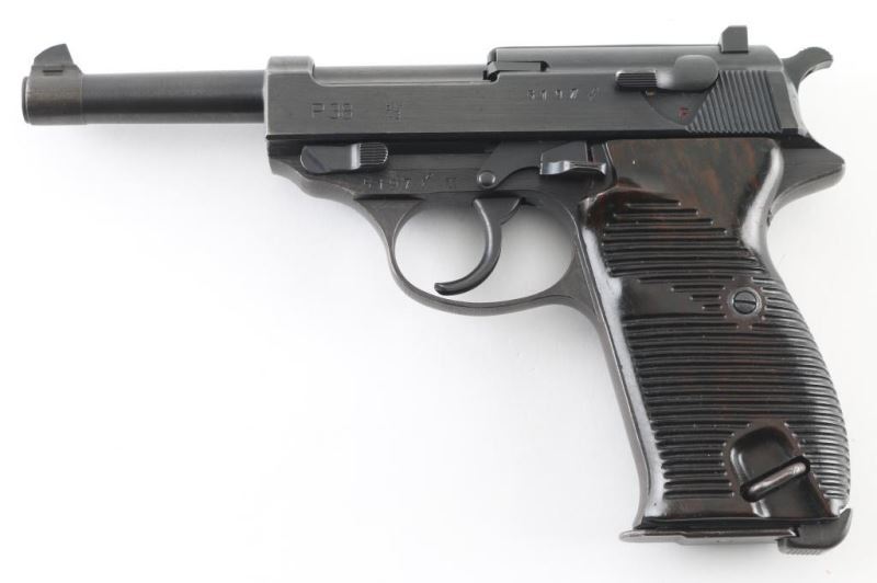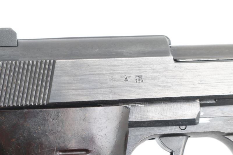 Pistol. Semi-Automatic. 8 rd Magazine. Third Reich era military issued sidearm. 4.9" barrel. Short recoil, hinged locking piece assisted breechblock. Matching serial numbers including the locking block. Waffenamts, eagle/135. Pistol has been dip-blued/Russian capture. Sloppy red paint applied to the F on the safety. Blued finish is about 98% with a few very minor scratches/edge wear. Bore is very good /Bright. Bakelite grips are very good. Original magazine stamped P38v Waffenamt, Eagle/135. NRA Condition-Very Good/Dip-Blued. C&R firearm