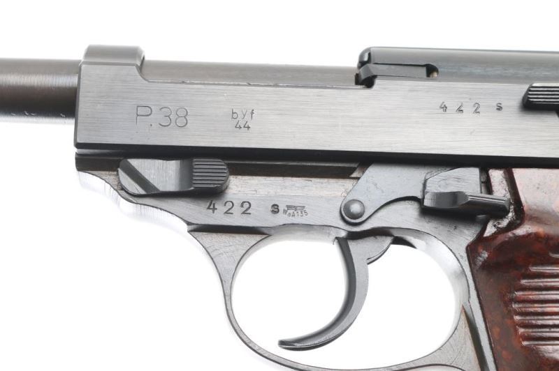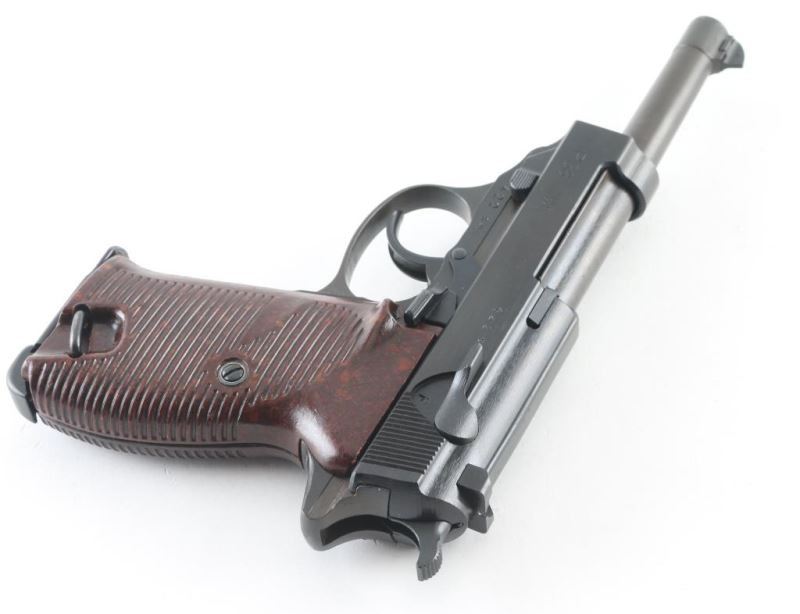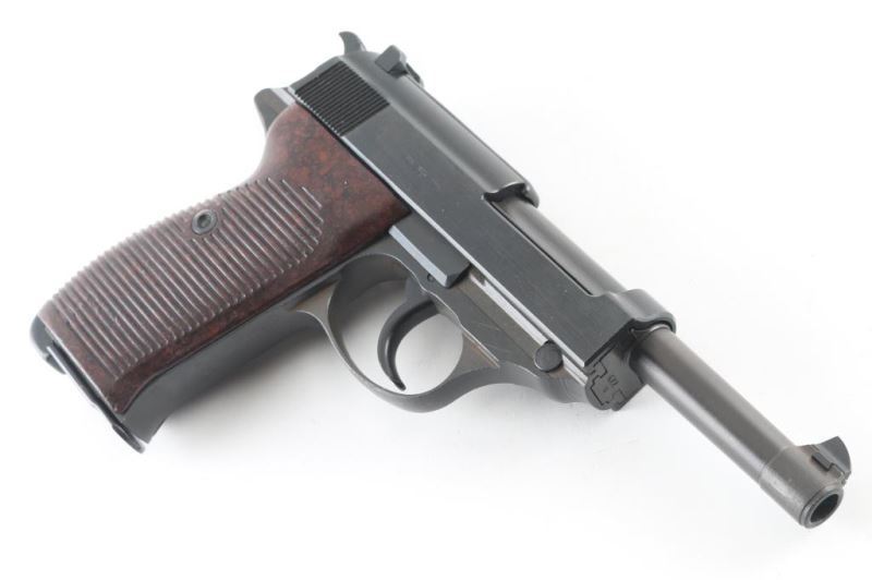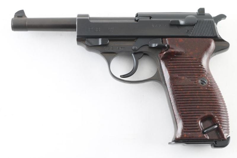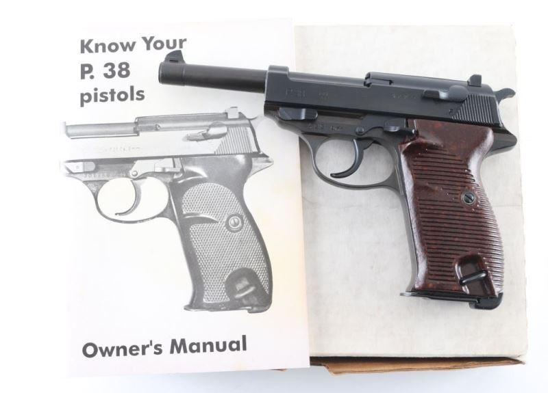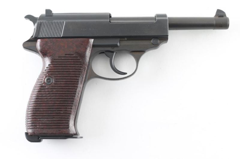 Pistol. Semi-Automatic. 8 rd Magazine. Third Reich era military issued sidearm. 4.9" barrel. Short recoil, hinged locking piece assisted breechblock. byf 44. Blued metal finish. Brown/Plum colored barrel, and locking block. Appears to be a Russian capture. Some internal springs are blued. stampings are crisp/Clear. Matching serial numbers including the locking block. Waffenamts, eagle/WaW135. "4" stamped on sight blade. Bore is very good/bright. bakelite grips are very good. Blued finish is about 97% with scratches/minor edge wear. Import stamp "NHM Co. Sacca" on tang. Original magazine stamped "P38v" Waffenamt, Eagle/WaW135. Comes in cardboard storage with later manual. NRA Condition-Very Good. C&R firearm