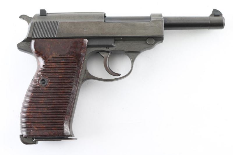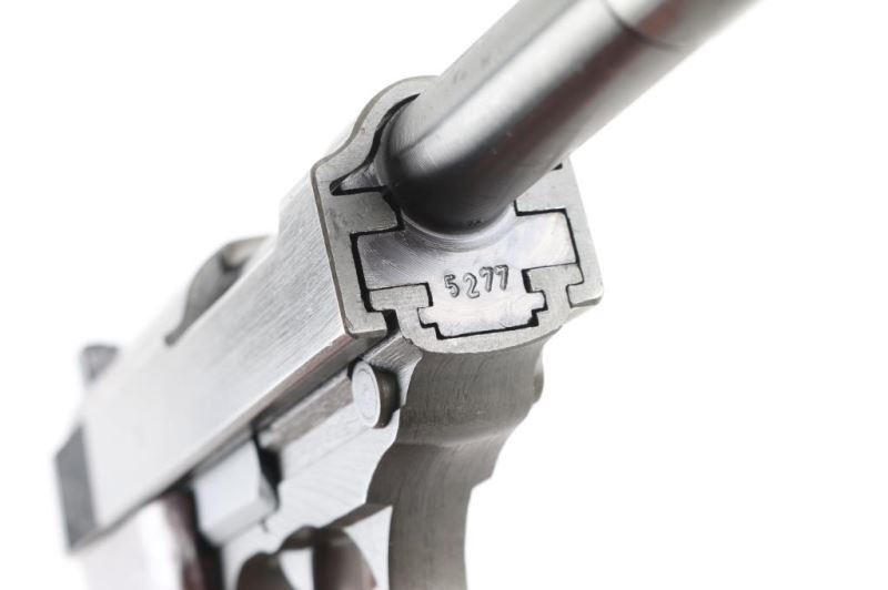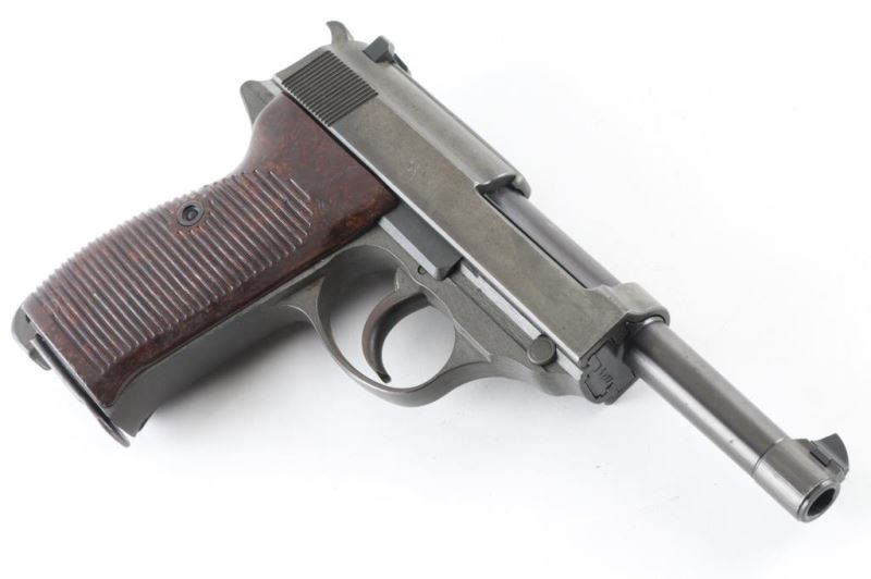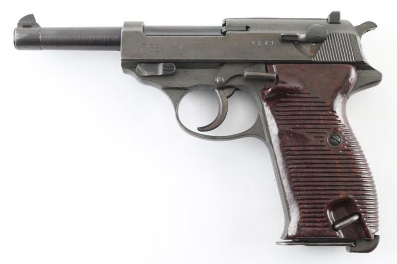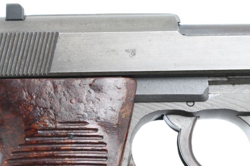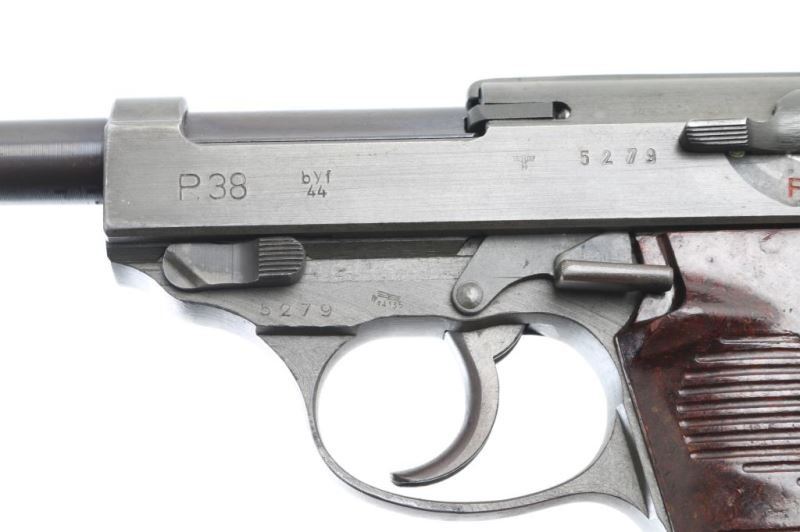 Pistol. Semi-Automatic. 8 rd Magazine. Third Reich era military issued sidearm. 4.9" barrel. Short recoil, hinged locking piece assisted breechblock. byf 44. This is a rare Eagle/F marked Police pistol. (On right slide) Serial numbers should fall between 4346-5501. Gray phosphate finish, blued barrel. Matching serial numbers including the locking block, except the barrel, which is off by two digits, 5277. Perhaps done at the factory. Waffenamts, eagle/Wa4135. Eagle/N proofs. Metal is is very good with a few minor scratches, slight muzzle wear. All markings are crisp, clear. Bore is very good/bright. Bakelite grips are very good. Original magazine stamped "P.38v", Waffenamt. A rare really nice conditioned pistol. NRA Condition-Very Good. C&R firearm