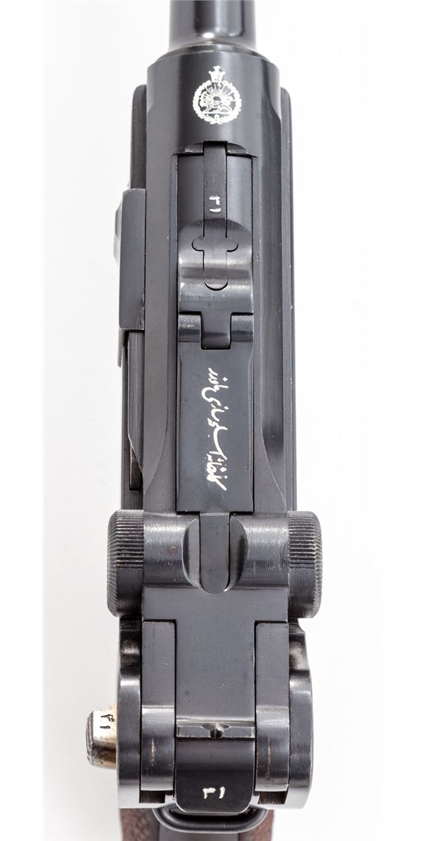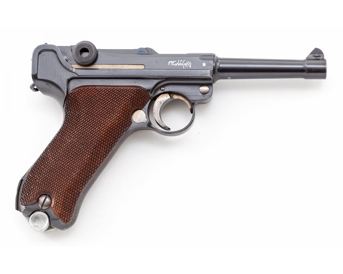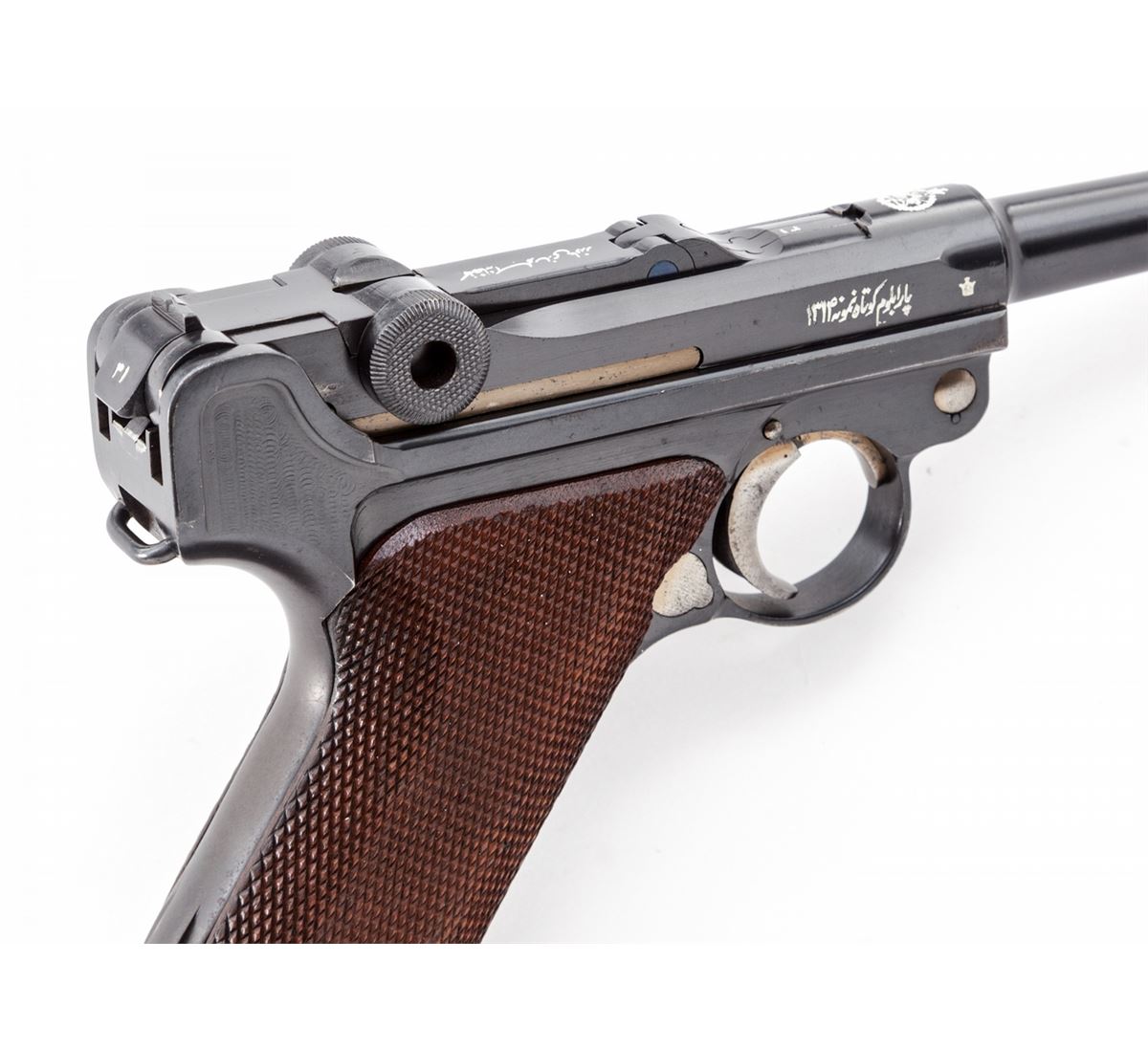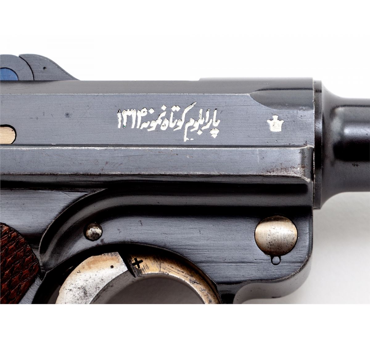 Mauser Persian Luger, #1302 (Farsi), 9mm, 4'' barrel, blue finish with straw small parts, factory checkered walnut grips, and matching tin-plated walnut based magazine. Shah's crown and lion to chamber area, toggle marked in Farsi. 1000 of these pistols were delivered in 1936 and another 1000 in 1942. This example is from the 1942 shipment and are considered very rare. Condition is excellent retaining approx. 97%+ original factory blue with thinning to front and backstrap, at high edges, and with very minor thinning and toning to straw parts. Grips and action are crisp, bore is bright. 1917 dated German brown leather holster shows light general scuffing and wear. Est.: $5,000-$7,500. (C&R/PPT) (John Siroonian estate)