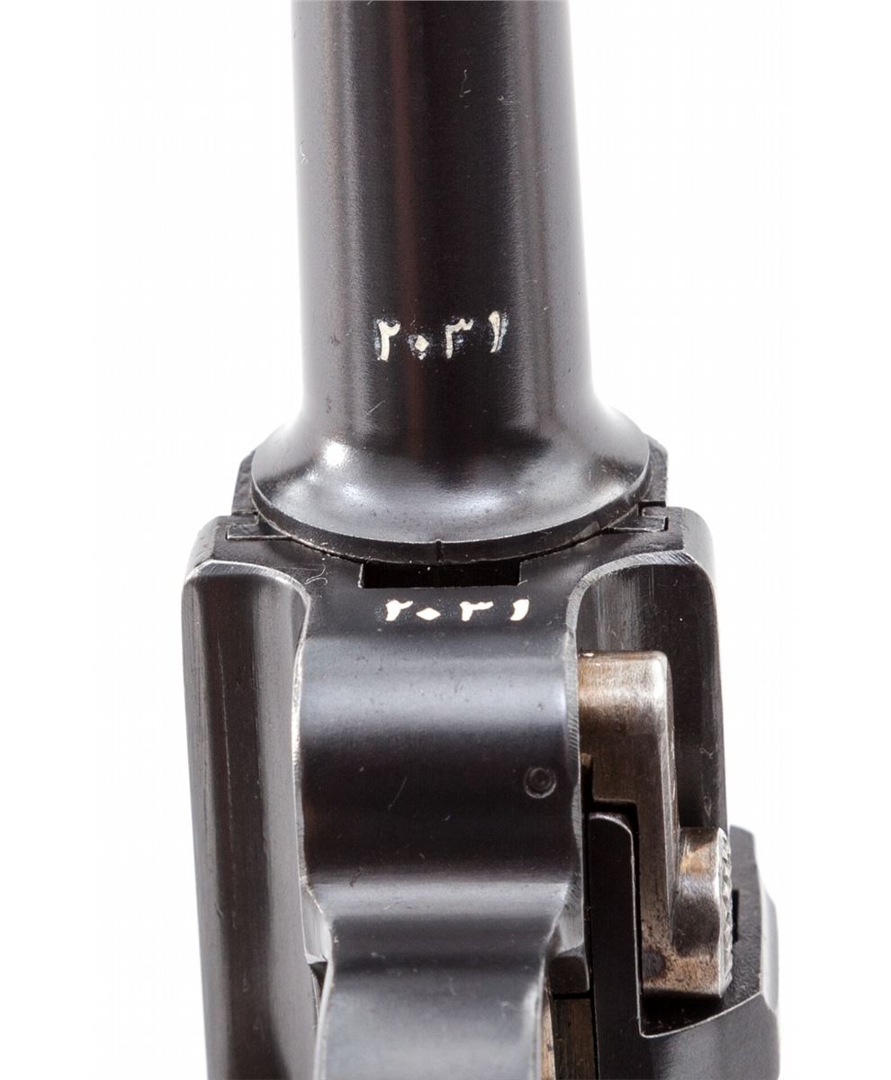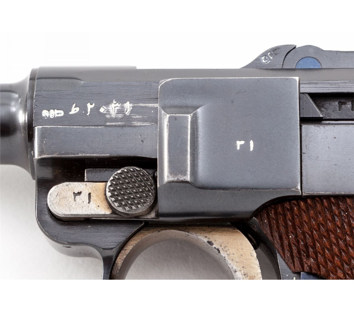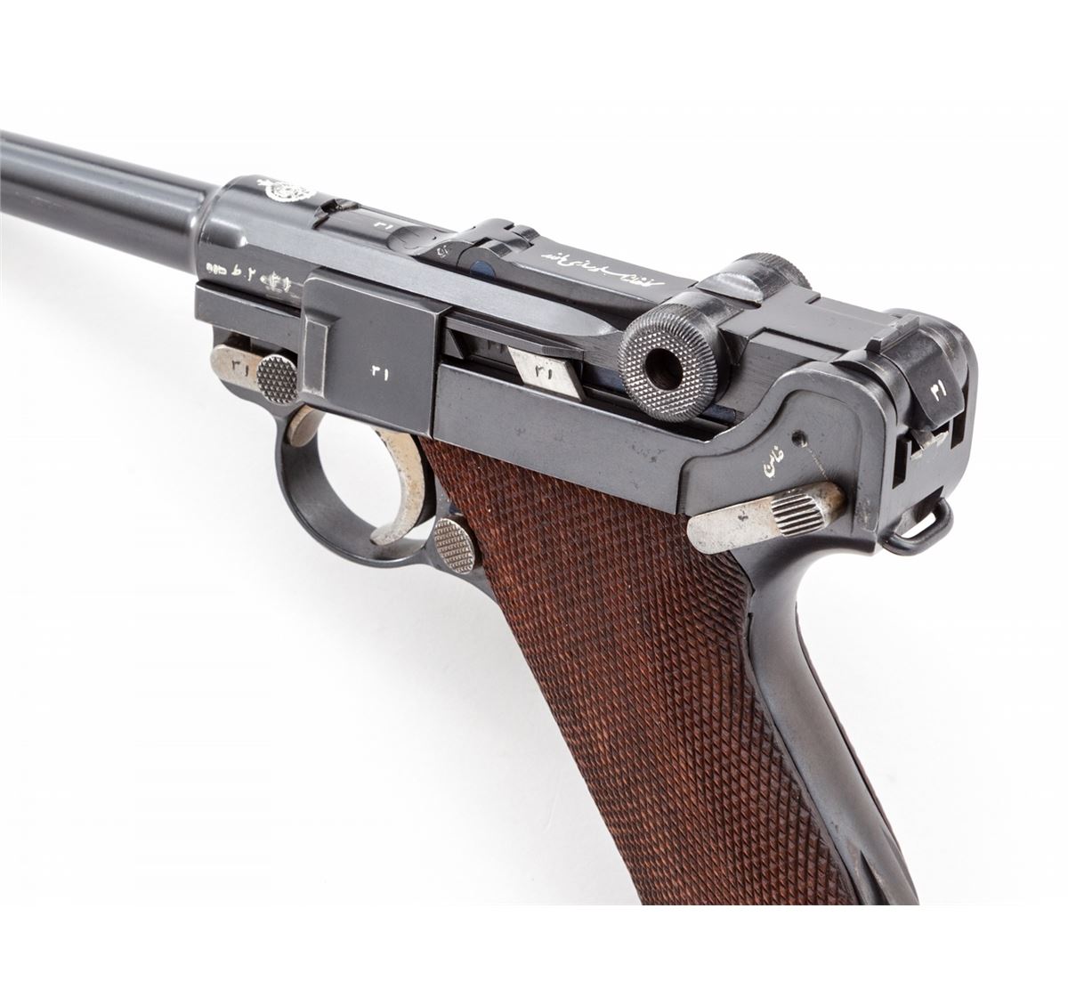 Mauser Persian Luger, #1302 (Farsi), 9mm, 4'' barrel, blue finish with straw small parts, factory checkered walnut grips, and matching tin-plated walnut based magazine. Shah's crown and lion to chamber area, toggle marked in Farsi. 1000 of these pistols were delivered in 1936 and another 1000 in 1942. This example is from the 1942 shipment and are considered very rare. Condition is excellent retaining approx. 97%+ original factory blue with thinning to front and backstrap, at high edges, and with very minor thinning and toning to straw parts. Grips and action are crisp, bore is bright. 1917 dated German brown leather holster shows light general scuffing and wear. Est.: $5,000-$7,500. (C&R/PPT) (John Siroonian estate)