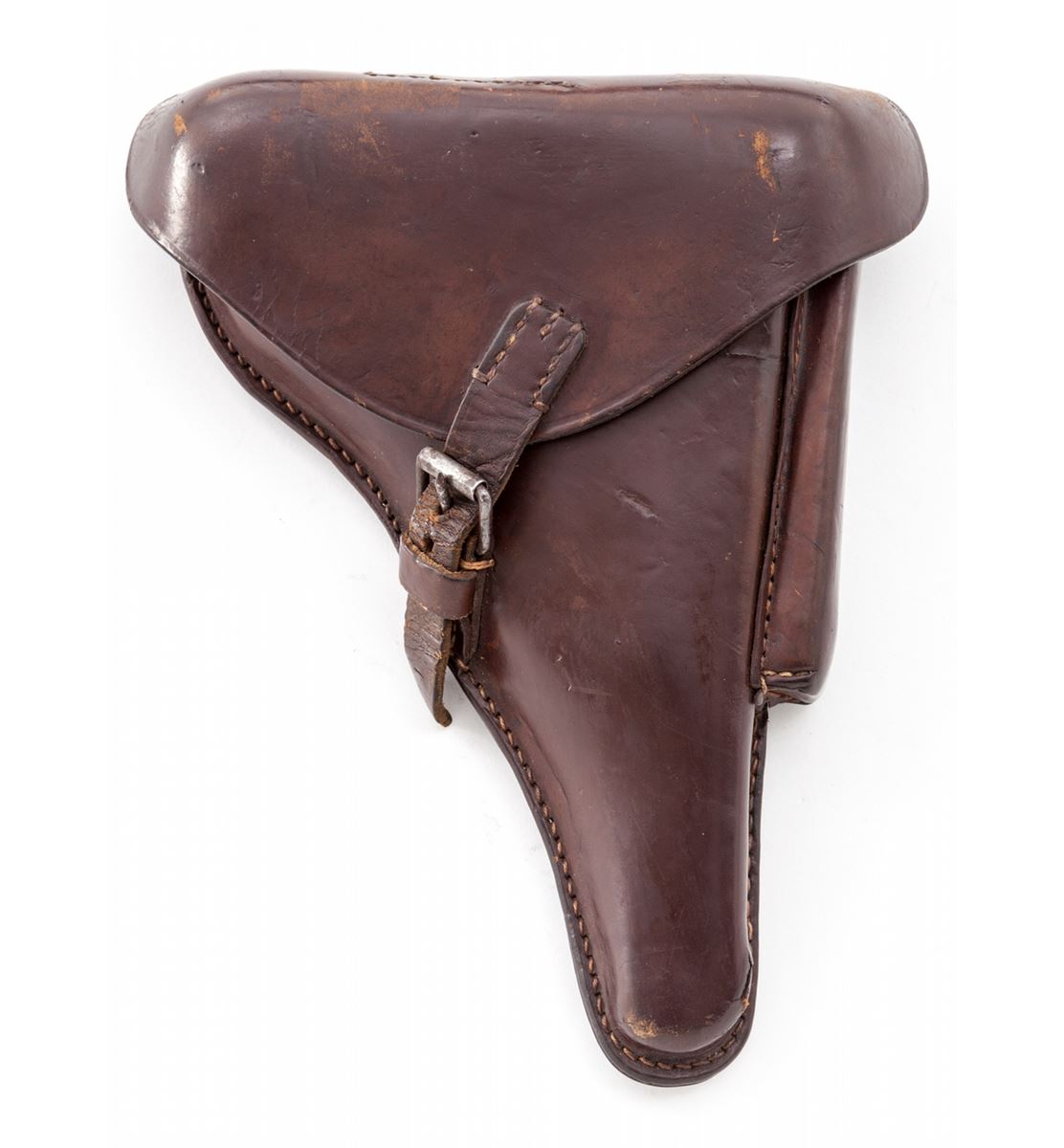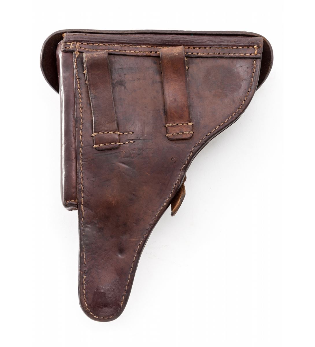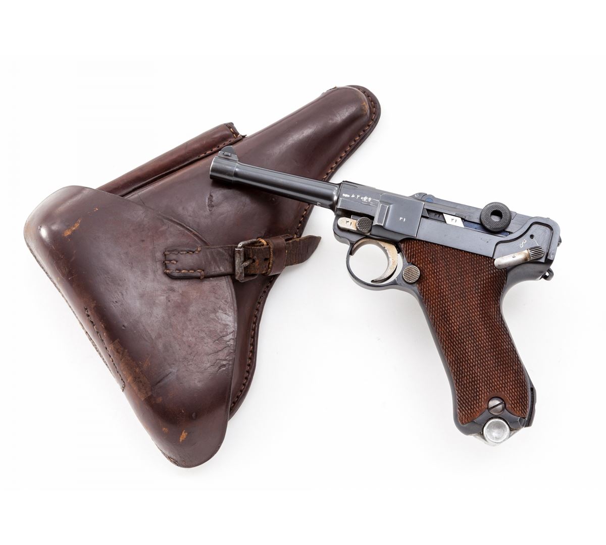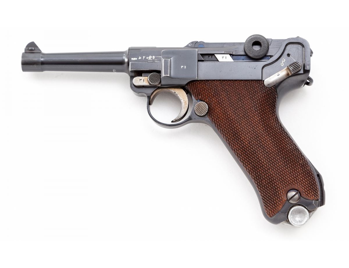 Mauser Persian Luger, #1302 (Farsi), 9mm, 4'' barrel, blue finish with straw small parts, factory checkered walnut grips, and matching tin-plated walnut based magazine. Shah's crown and lion to chamber area, toggle marked in Farsi. 1000 of these pistols were delivered in 1936 and another 1000 in 1942. This example is from the 1942 shipment and are considered very rare. Condition is excellent retaining approx. 97%+ original factory blue with thinning to front and backstrap, at high edges, and with very minor thinning and toning to straw parts. Grips and action are crisp, bore is bright. 1917 dated German brown leather holster shows light general scuffing and wear. Est.: $5,000-$7,500. (C&R/PPT) (John Siroonian estate)