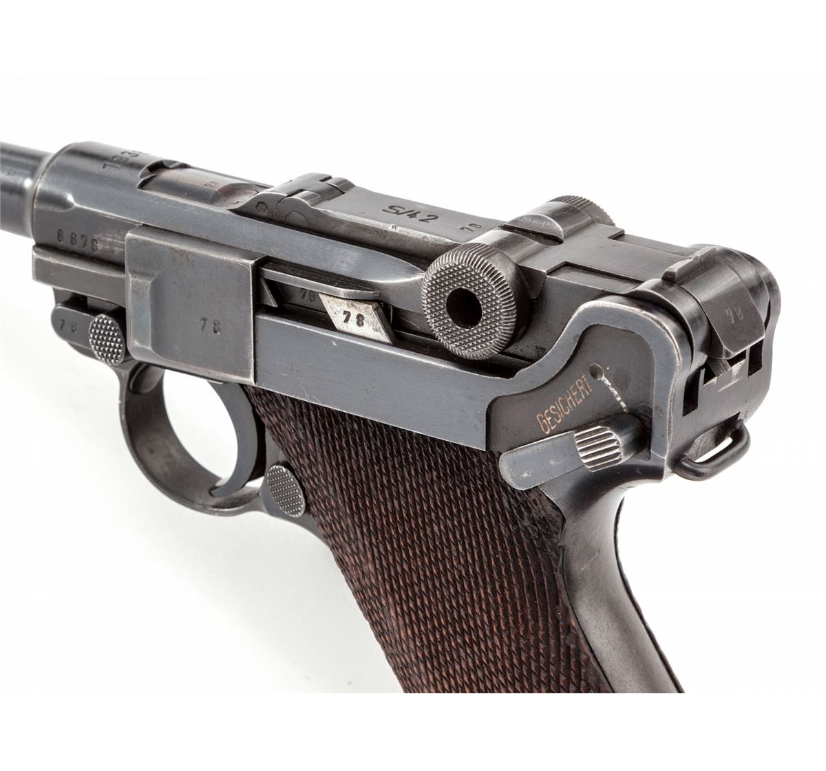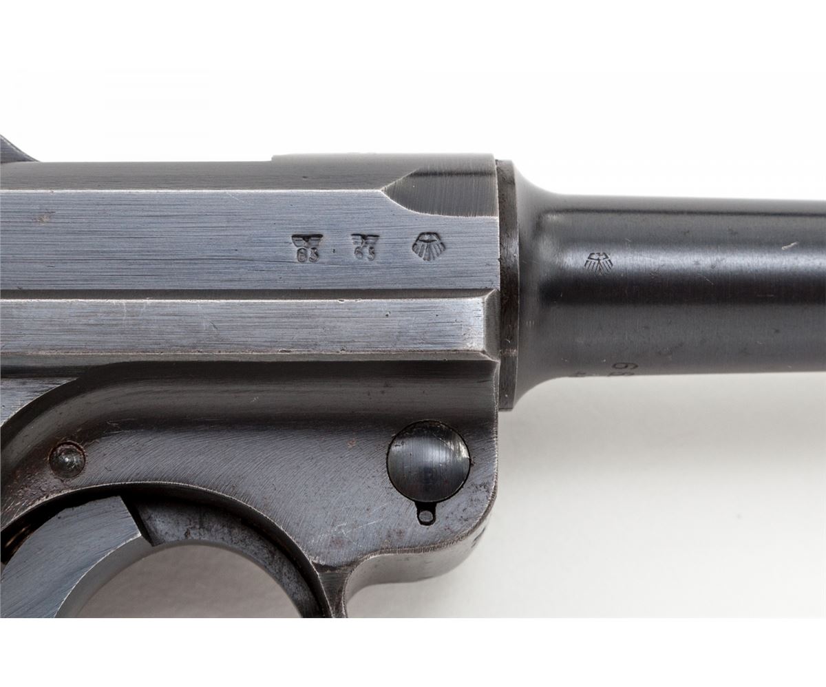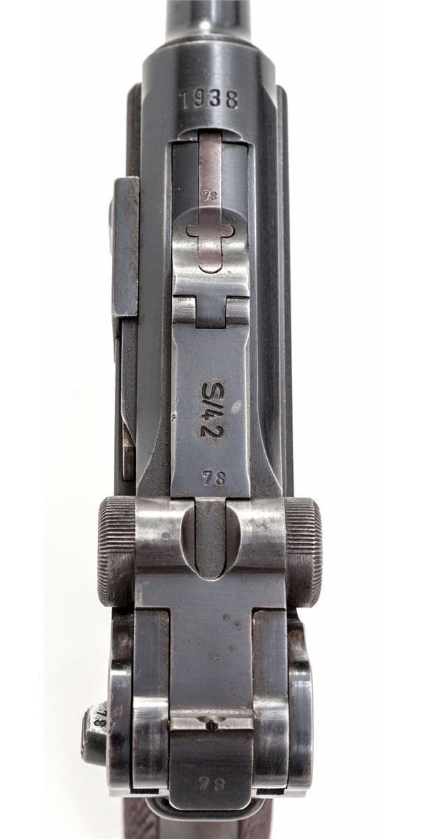 Mauser S/42 (1938) Luger, #6678m, 9mm, 4'' barrel, blue finish, checkered walnut grips, with one matching blue-bodied aluminum based magazine. Chamber marked 1938, toggle marked ''S/42'', ''Gesichert'' and ''Geladen'' marked safety and extractor, with ''(eagle)/63'' and ''83'' military acceptance markings. Condition is excellent retaining approx. 97% blue with light high edgewear at muzzle and top and right side edge of sideplate. Minor thinning to front and backstrap. Grips show light to just moderate flattening, specifically to left panel. Action is crisp, bore is bright. Est.: $2,000-$3,000. (C&R)