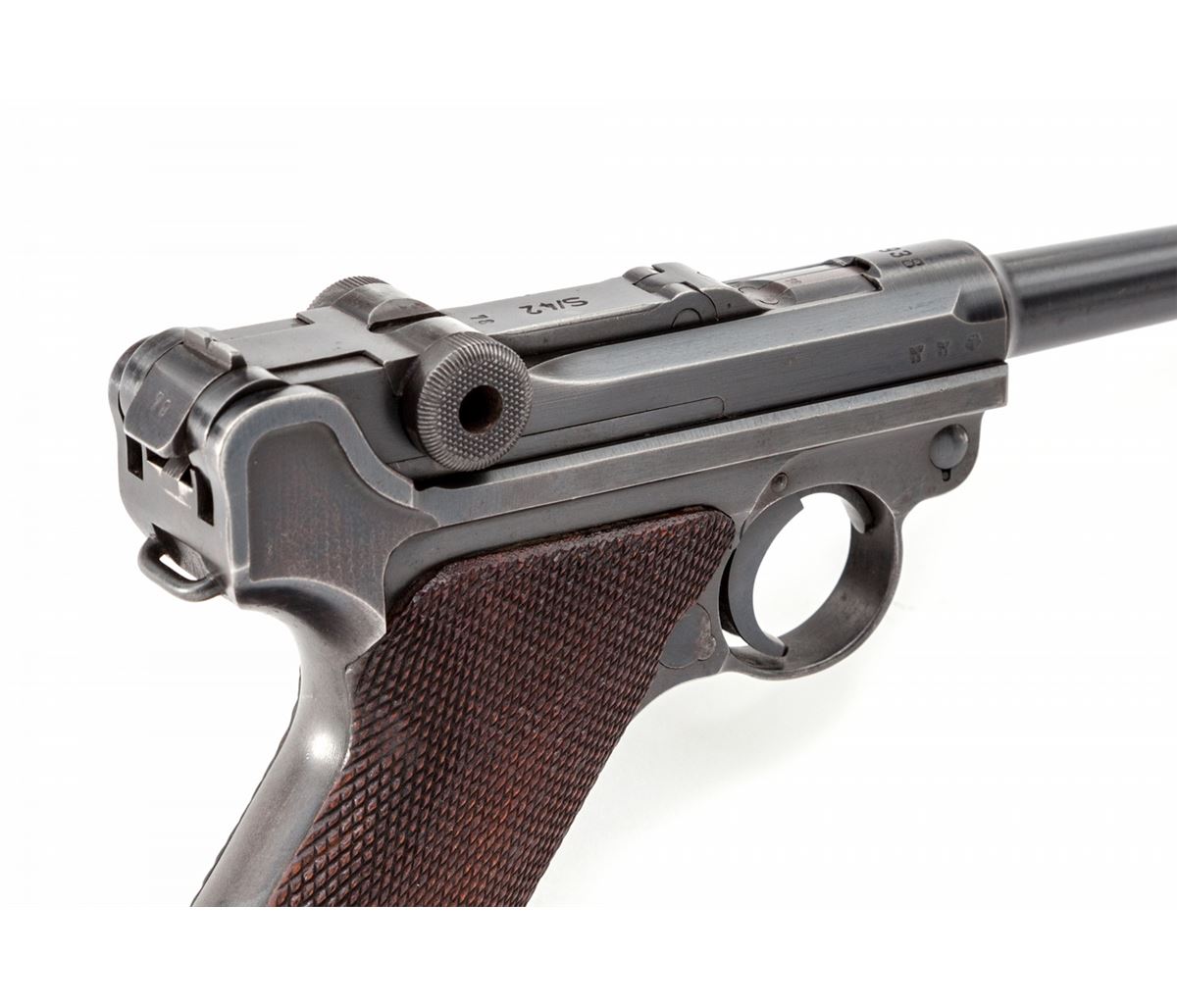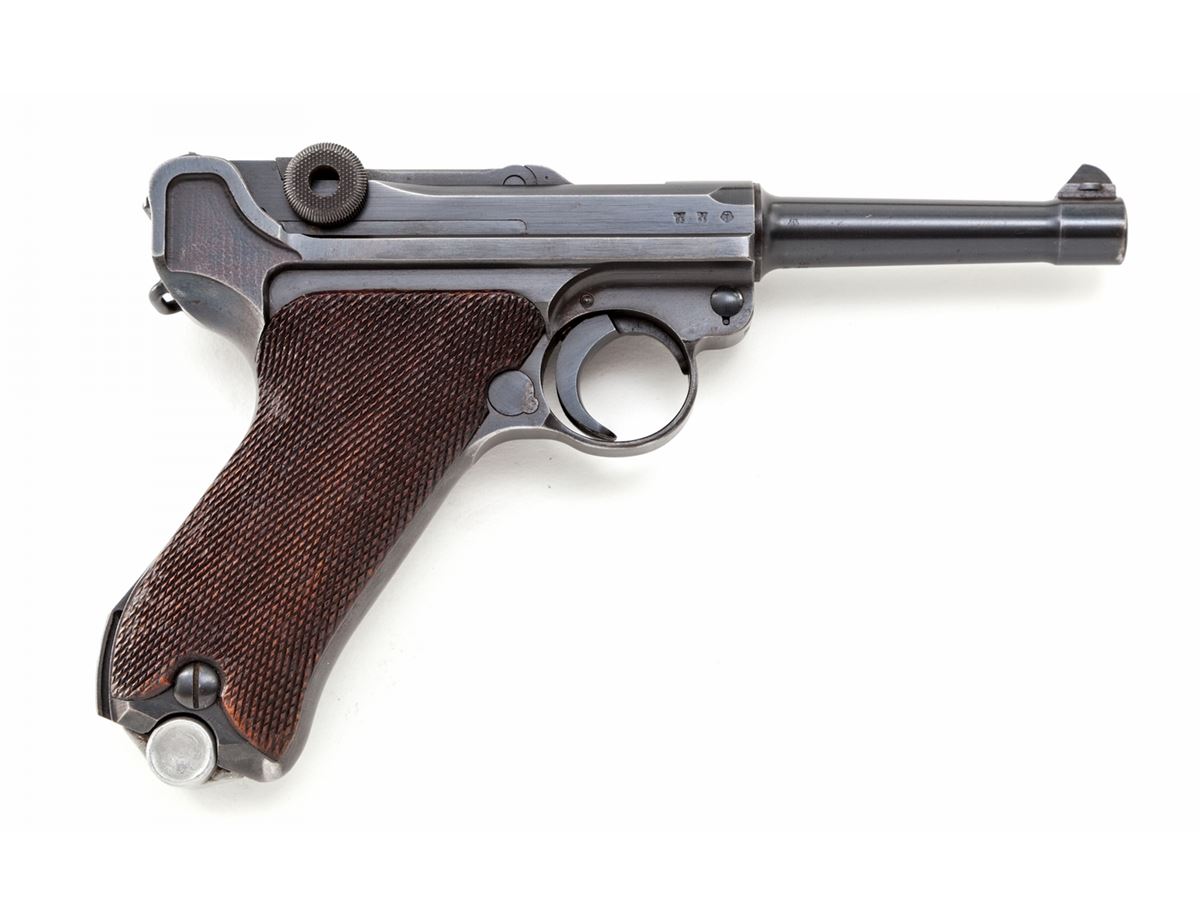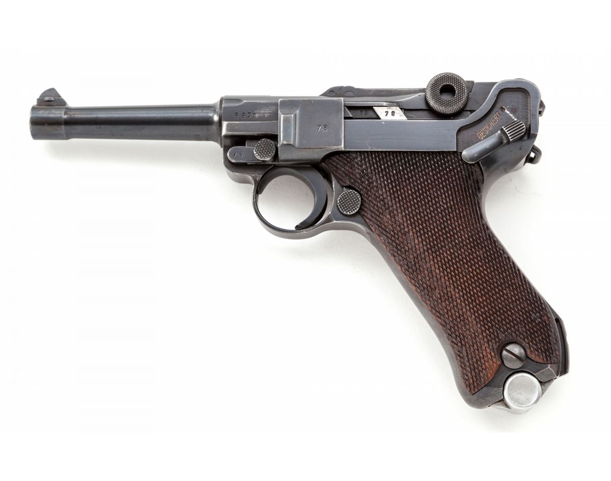 Mauser S/42 (1938) Luger, #6678m, 9mm, 4'' barrel, blue finish, checkered walnut grips, with one matching blue-bodied aluminum based magazine. Chamber marked 1938, toggle marked ''S/42'', ''Gesichert'' and ''Geladen'' marked safety and extractor, with ''(eagle)/63'' and ''83'' military acceptance markings. Condition is excellent retaining approx. 97% blue with light high edgewear at muzzle and top and right side edge of sideplate. Minor thinning to front and backstrap. Grips show light to just moderate flattening, specifically to left panel. Action is crisp, bore is bright. Est.: $2,000-$3,000. (C&R)