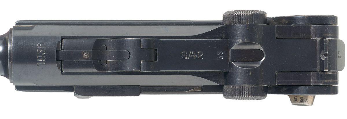 "1936" dated chamber and "S/42" marked toggle, with standard markings and features, matching serial numbers and aluminum base blue magazine numbered to another gun.