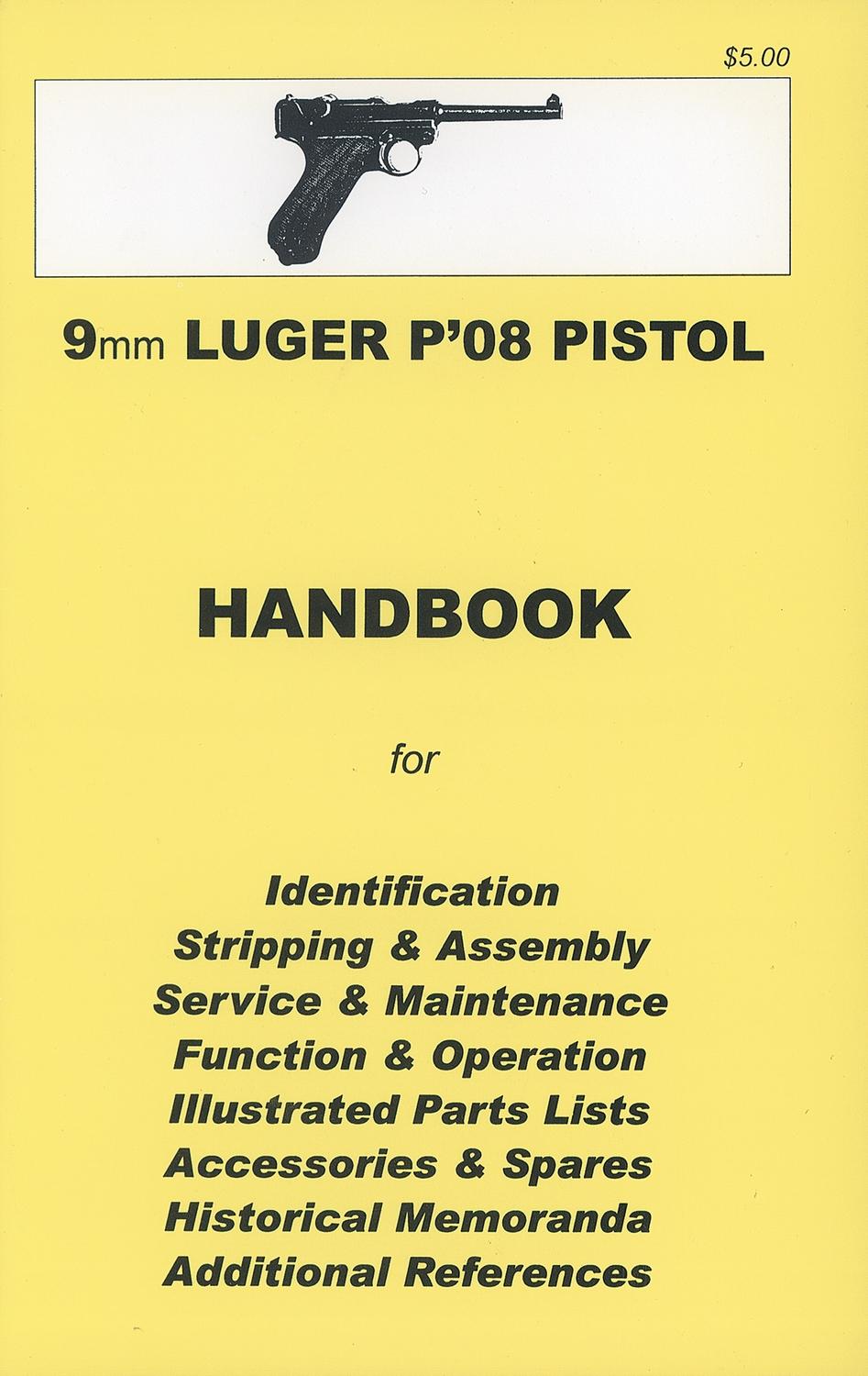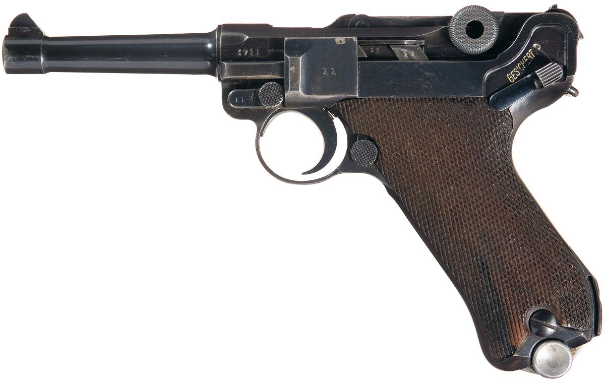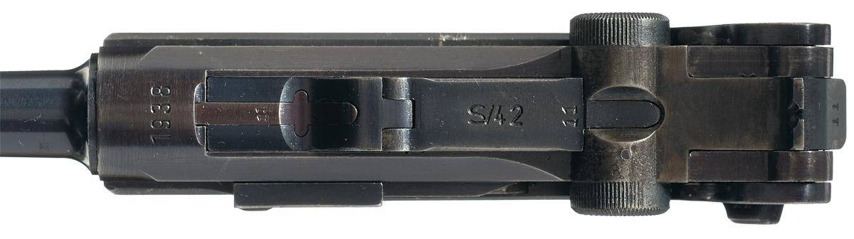Dated 1938 on the chamber, with the "S/42" code on the toggle. "Eagle/63" and "droop wing eagle" proofs on the right side of the barrel extension and on the barrel, with the firing proof on the left side of the breechblock, and "GESICHERT" and "GELADEN" on the upper safety area and extractor, respectively. Matching numbers on the latch, side plate, sear, safety, toggle links, extractor, trigger, hold open, grips, toggle link, breechblock and firing pin. Checkered hardwood grips and blue magazine with aluminum base. With a brown leather flap holster, with markings of E.G. Leuner, Bautzen, 1941 on the back, takedown tool, a nickel finished wood base magazine, and a 9mm Luger P-08 Pistol handbook.