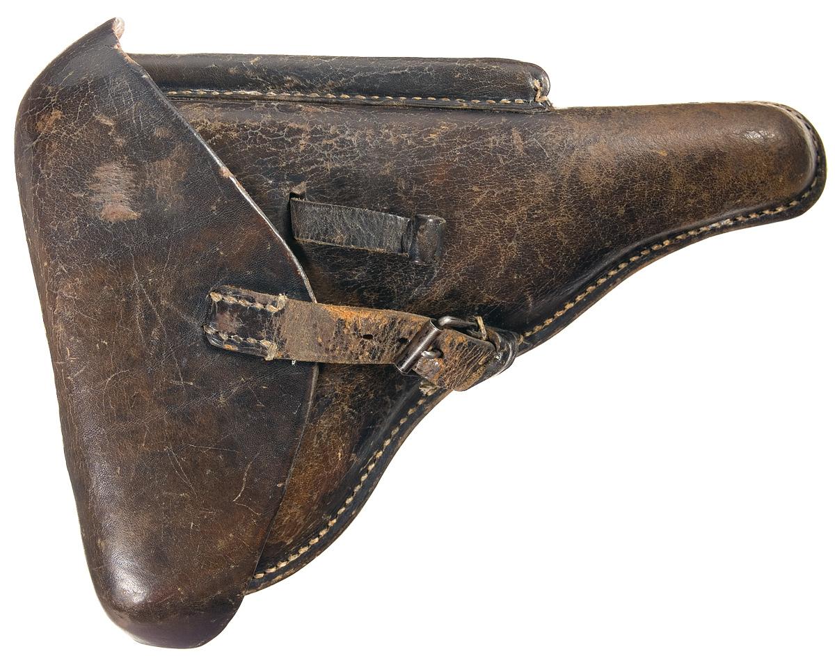Condition: Very fine as partially refinished (cold blue on grip straps), with 90% of the original blue finish, showing bright wear on the edges, a brown patina on the grip straps and toggle links, scattered spotting and mild handling marks. Grips are also very fine, with mild pressure dents. Holster is good, with scuffing and cracks. Mechanically excellent.