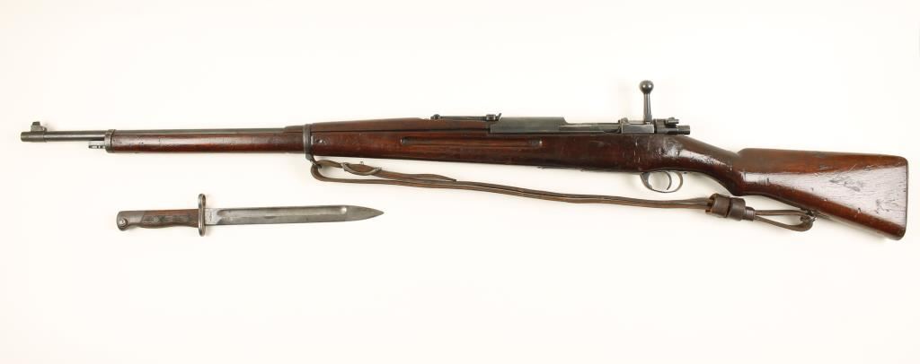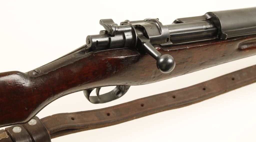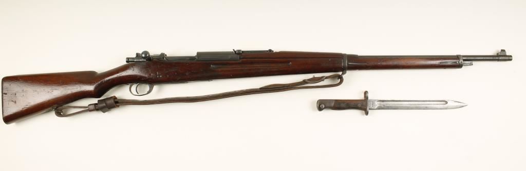 Blued Japanese made bolt-action military rifle with a 29" barrel and a bayonet. Bluing has turned to brown on the muzzle end of the barrel with some dings and surface rust stains. Receiver, dust cover and bolt are all in good condition with edge wear. Butt plate has a sliding door and they are worn with rust stains and pitting. Wood id well battered. Bore is shiny with sharp rifling. Action works well. Bayonet is Siamese marked and has a blade that is 9-3/4" long and the scales are very worn. Condition is fair to good. *Modern Firearm*